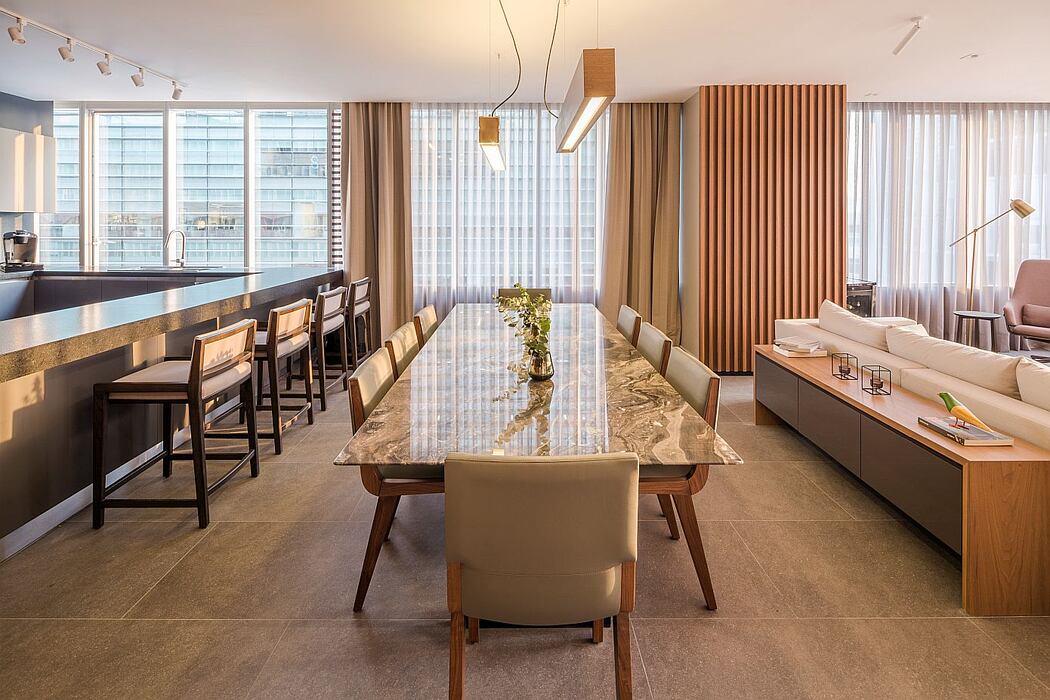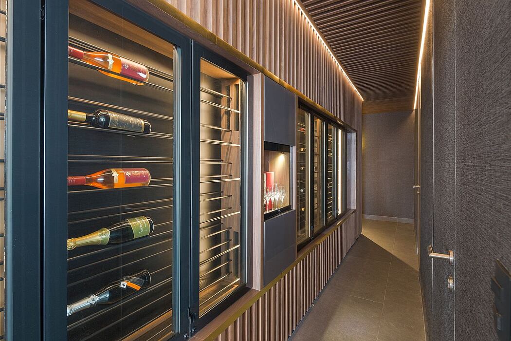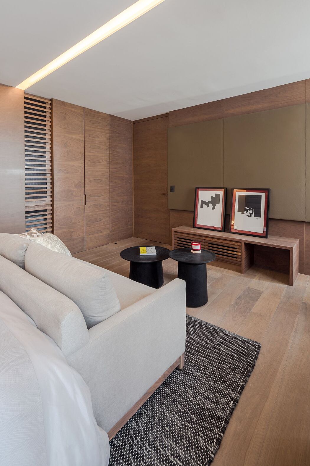 Turning through the hallway, the impressive 30 feet long wine cellar, framed in polished brass, hosts the owner’s wine collection – most of which comes from his winery in Valle de Guadalupe. This is the most important element of the apartment; it was designed almost as a museum display, carefully illuminated.