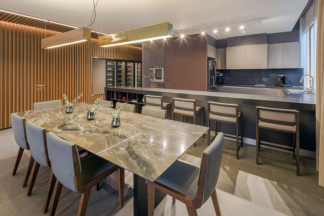 In the social area, the open kitchen creates a casual ambiance. The long bar separating the kitchen can host a dinner where wine can be paired with the food they prepare – another of the client’s hobbies.