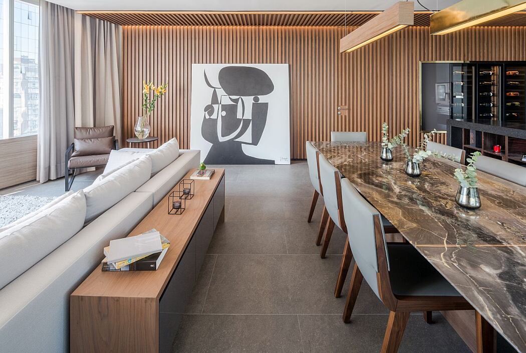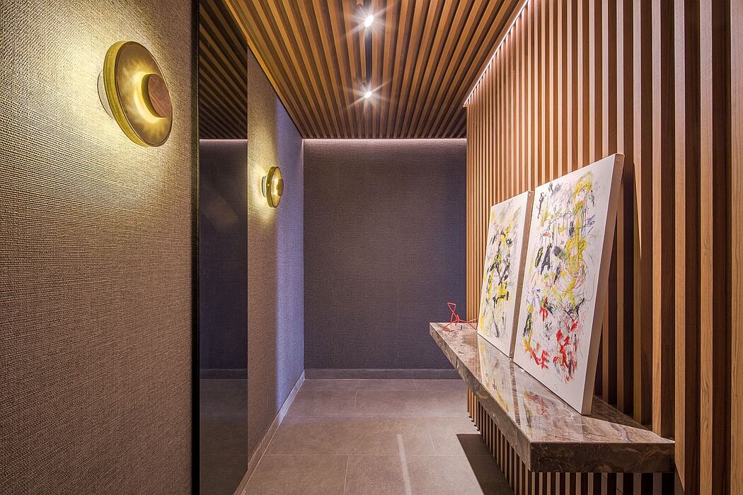 By entering through the hall, the visitor is received by a warm ambience where the wooden panels in the walls and ceiling are interrupted by an arabescato grigio marble shelf, which hosts one of the contemporary works of art found through the apartment.