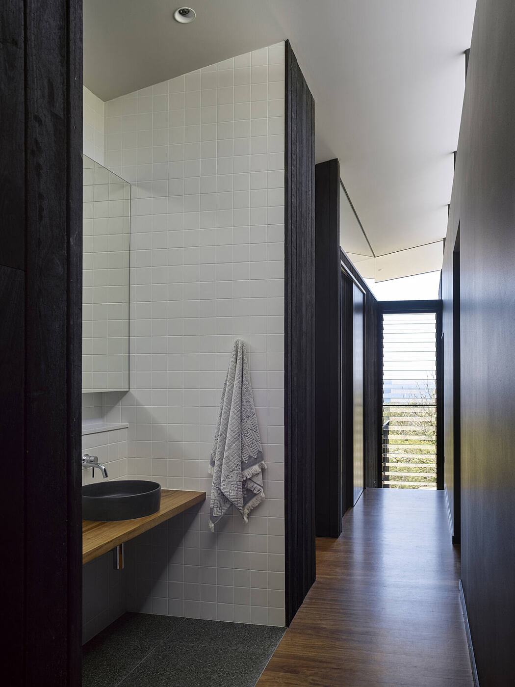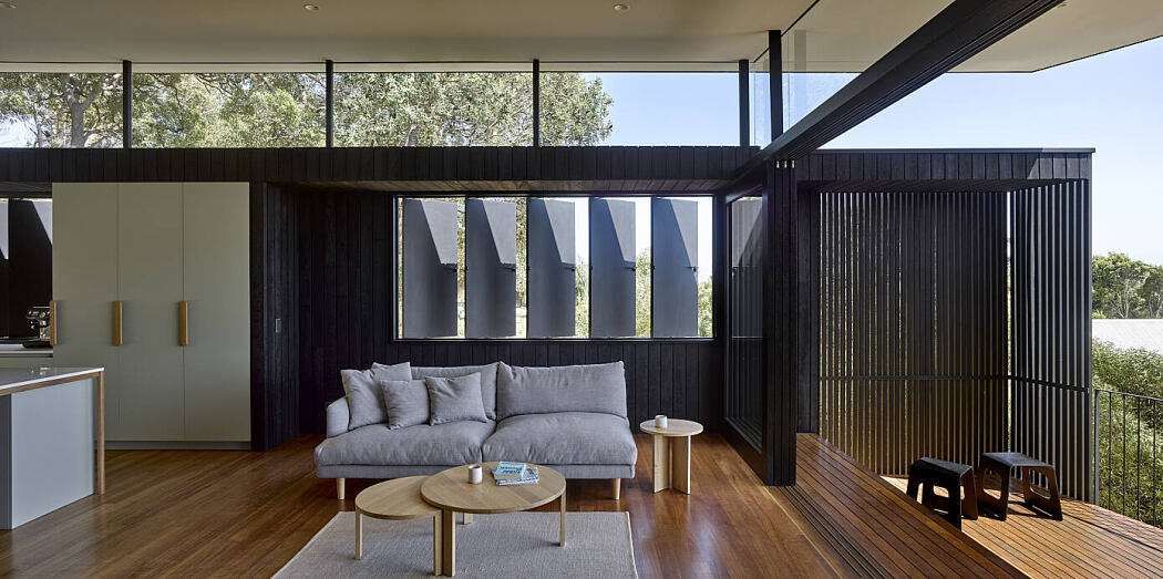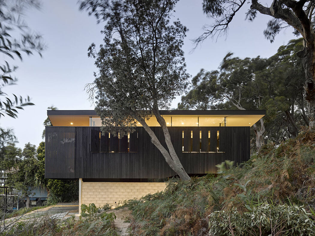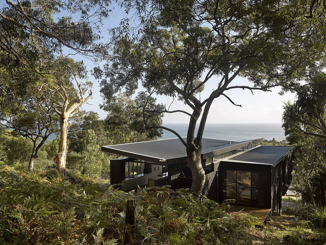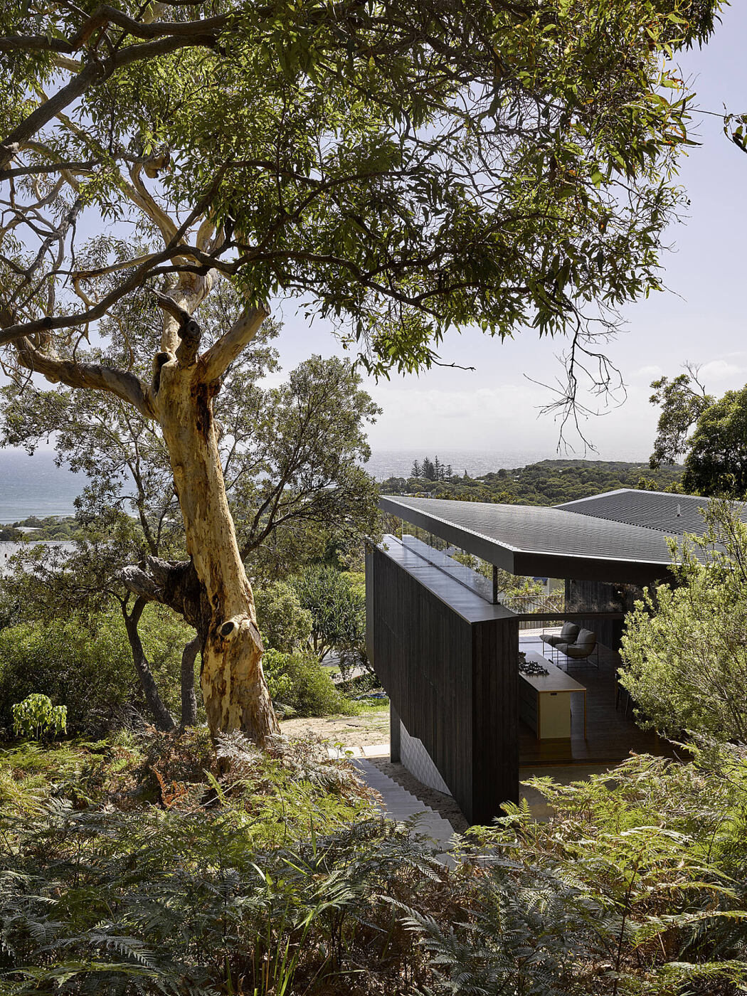 A singular cladding material – Shou Sugi Ban, or charred timber – helps to blend the building within the bushland setting while at the same time achieving BAL 29 fire rating.