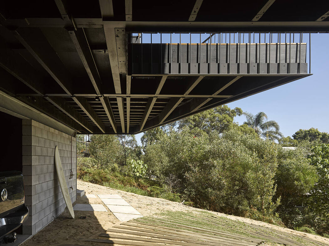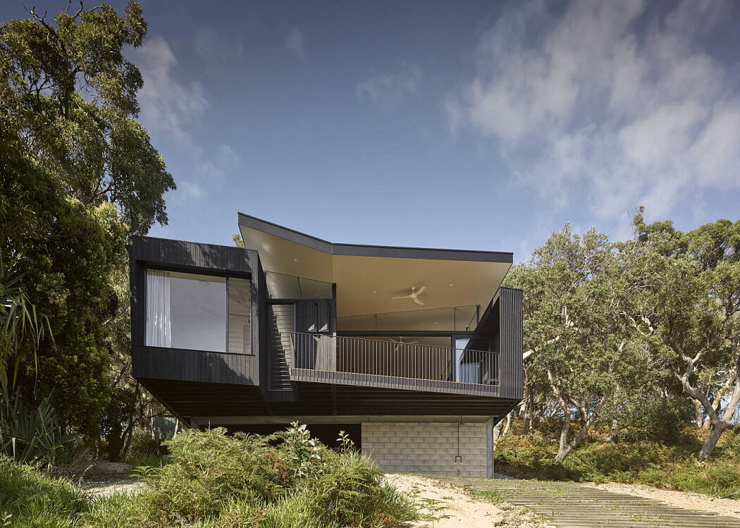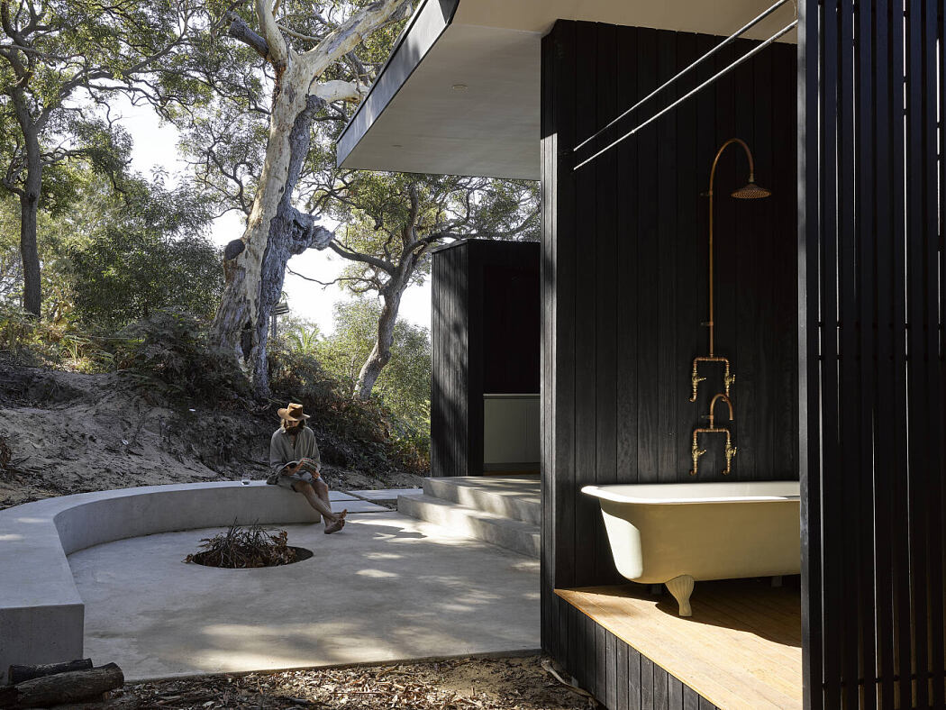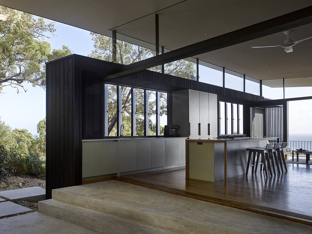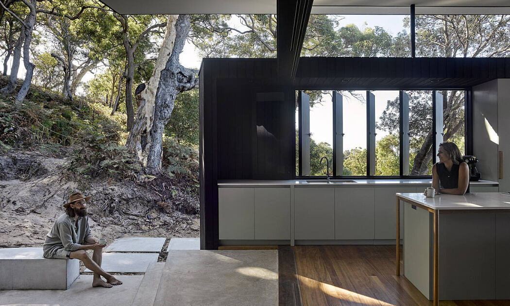 Built for three families, it comfortably accommodates up to 10 people. Sleeping and bathing spaces are deliberately small, while the communal area is generous and opens up to views of the sea and surrounding bushland. This openness enhances the sense of being “on holidays”.
