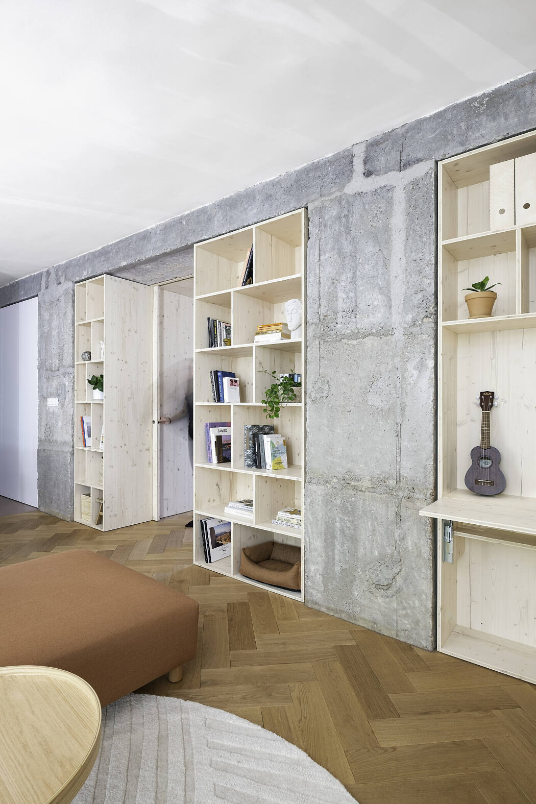 The construction adjustments fully open up the layout along two main axes, strengthen the continuity of the space and illuminate the interior. The rough structural base contrasts with the precise joinery.