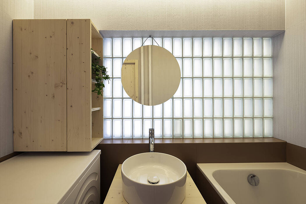 Daylight from the kitchen window reaches the bathroom through translucent glass blocks without violating the intimacy.