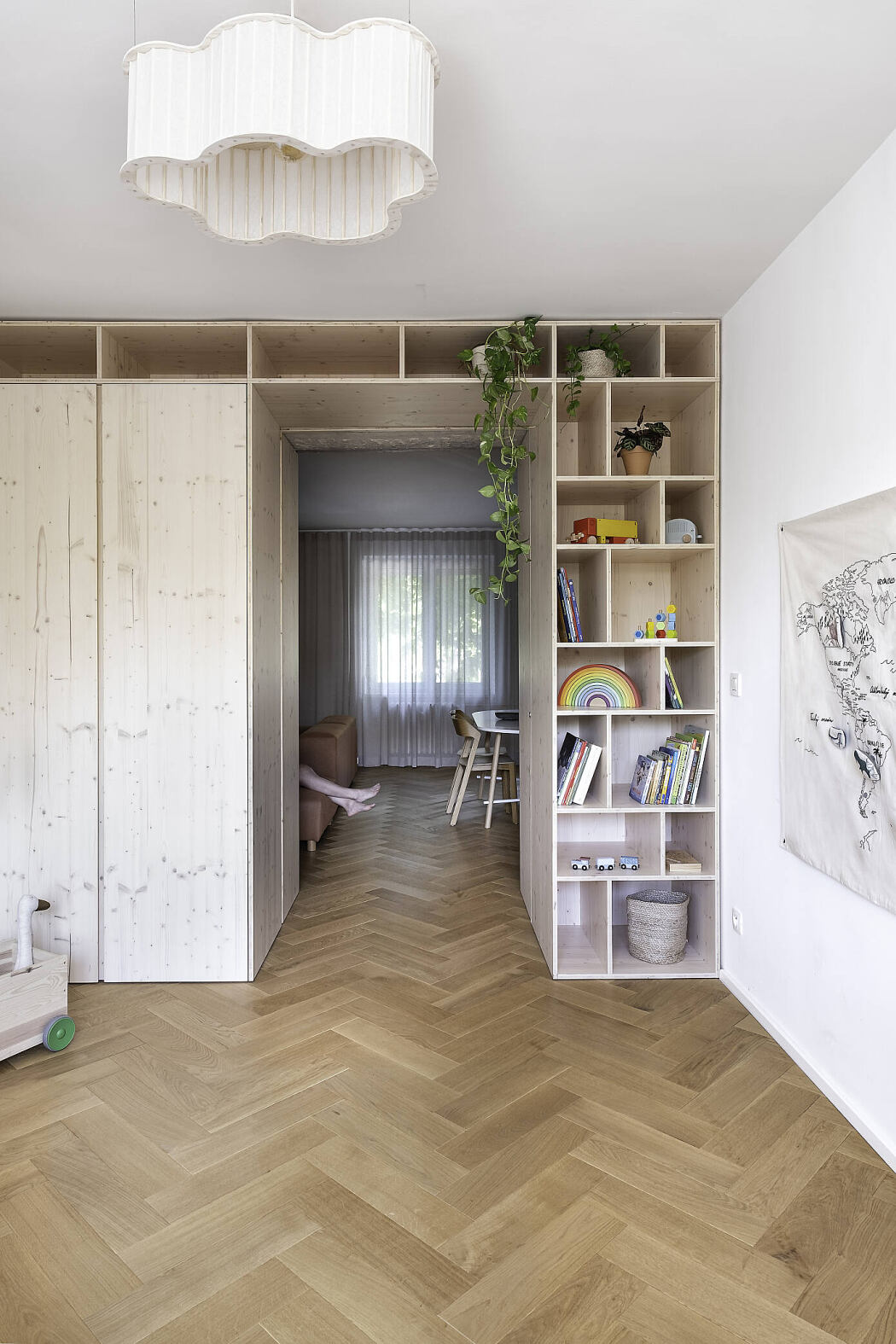 The aim to open up vistas across the entire floorplan allows to use the full potential of the double exposure layout with windows at the level of the adjacent greenery. The entrance area thereby gains a view out and across the flat led along the exposed structural element. A glass transom created by the painter Zofia Dubova illuminates the area even in case of a closed bedroom door.
