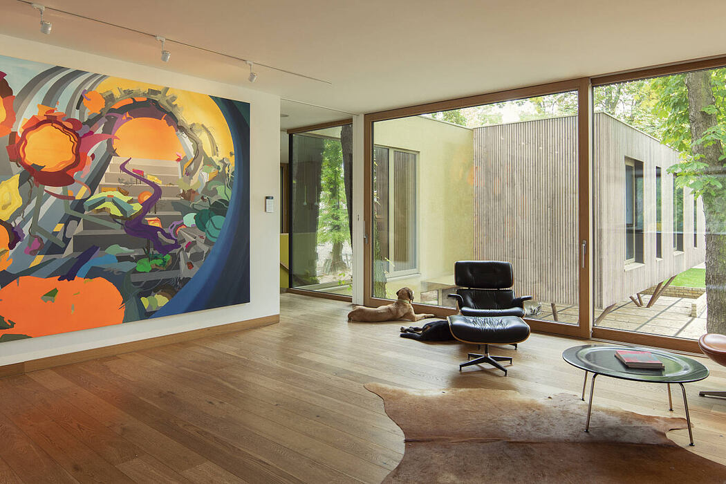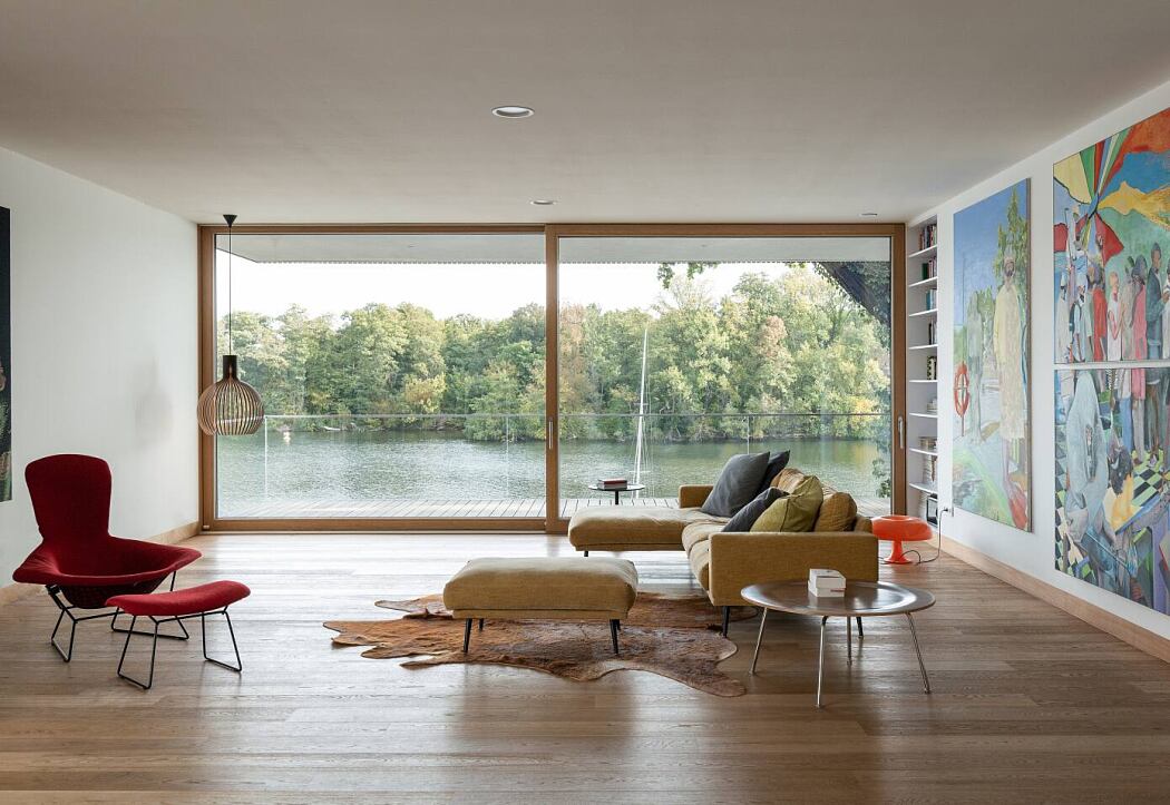 Despite the height of the living level, the loggia is nevertheless situated 8 meters above the water surface, making the lake ever present in the house. “This provides an indescribable quality of living“, says Zwick. “At breakfast time you already see gray herons and swans passing by at eye level and in the evening here and there you will see otters waddling through the shallow water.“