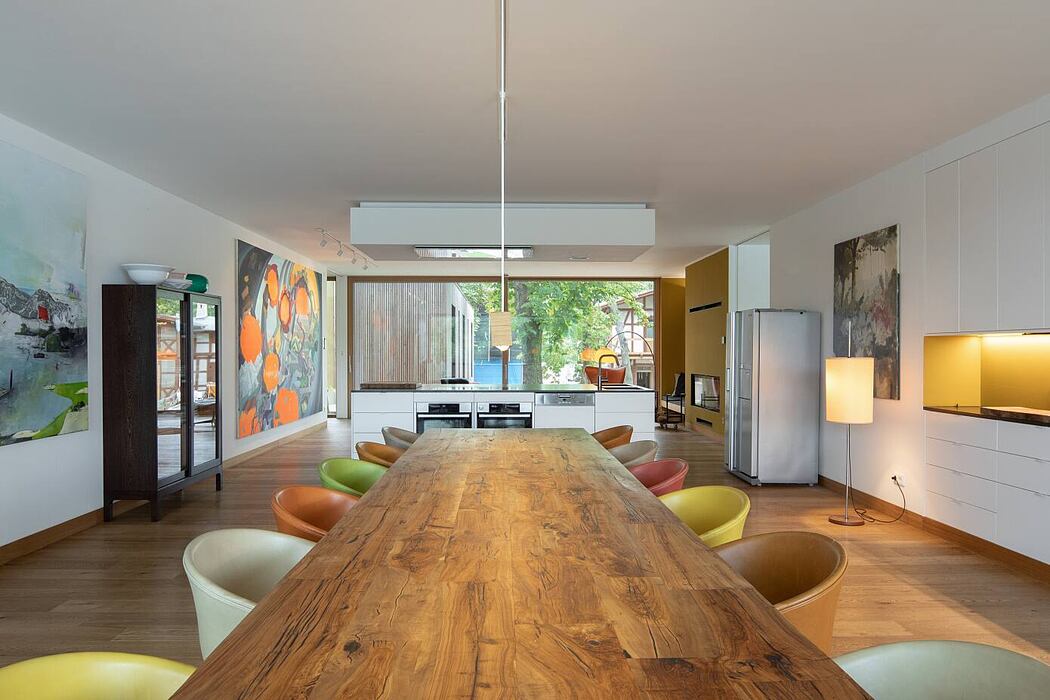The heart of the house is the large kitchen-dining room, with a fireplace, seating area and a 7.5 m long olive wood table. Here is where the family with six children come together and enjoy their meals. The two big dogs, Schröder and Tilda, have also found their favourite spots here, where they spend hours warming their fur coats next to the lit fireplace.