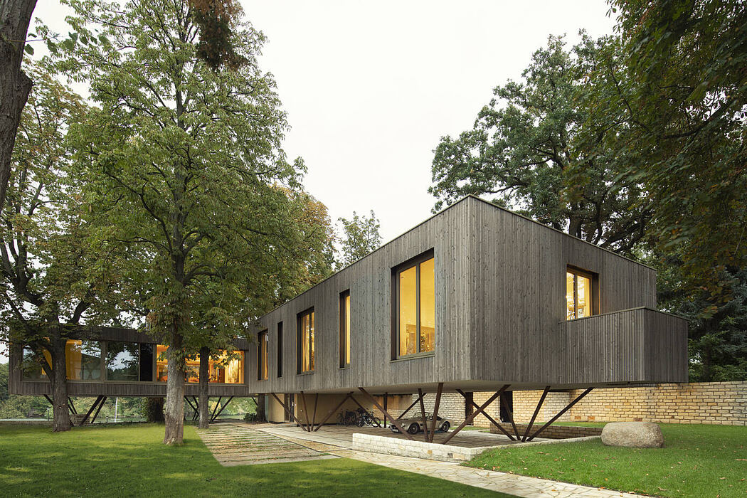 Today the house stands on 10 individual foundations and 40 diagonal posts, which raise the house 3 meters above the ground. With its façade made of vertical narrow larch slats, the structure merges with the crowns of the huge surrounding trees.