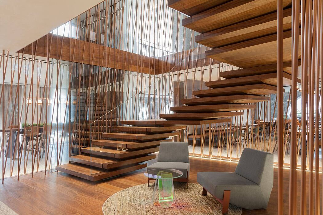 In the majestic lobby, the Fontanot staircase in prized Canaletto Walnut, blends harmoniously with the interior decor, lending it that touch of excellence for which the Italian company is famous.
