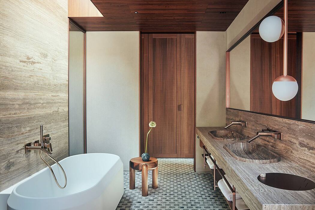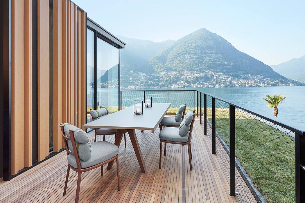 Thanks to its privileged position between the lake and the mountains, the architecture ensures a stunning view and fits perfectly into the landscape, enhancing its natural beauty. The surrounding atmosphere, characterized by sober design and personalized service, was a source of inspiration in the choice of materials: wood and stone are the protagonists, along with copper and textiles; the project represents a true oasis of relaxation, offering many exclusive comforts, such as the small fleet of watercraft designed by Cantiere Ernesto Riva, exclusively for the hotel.