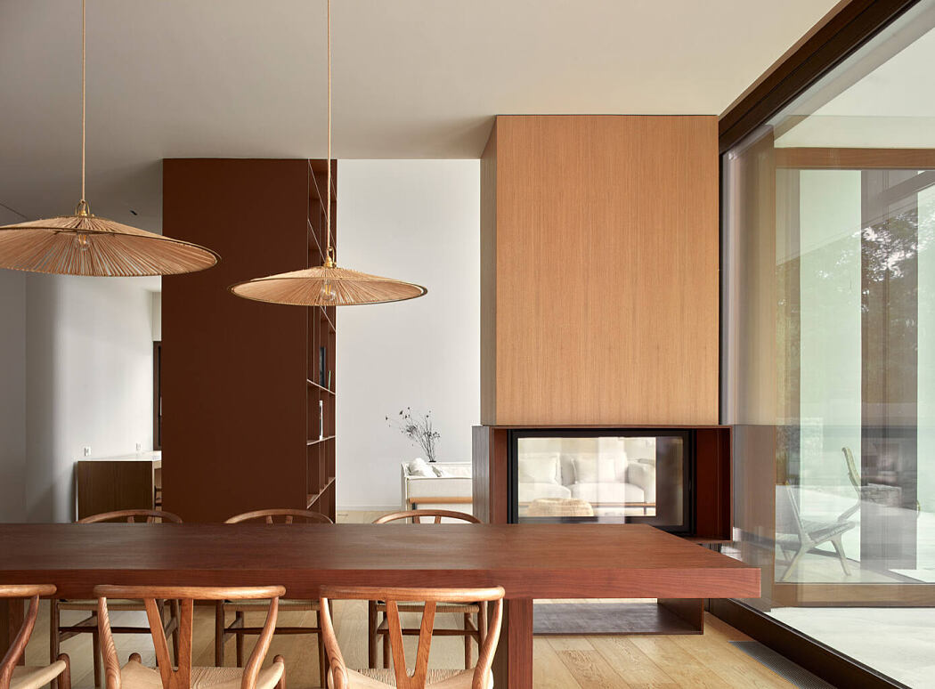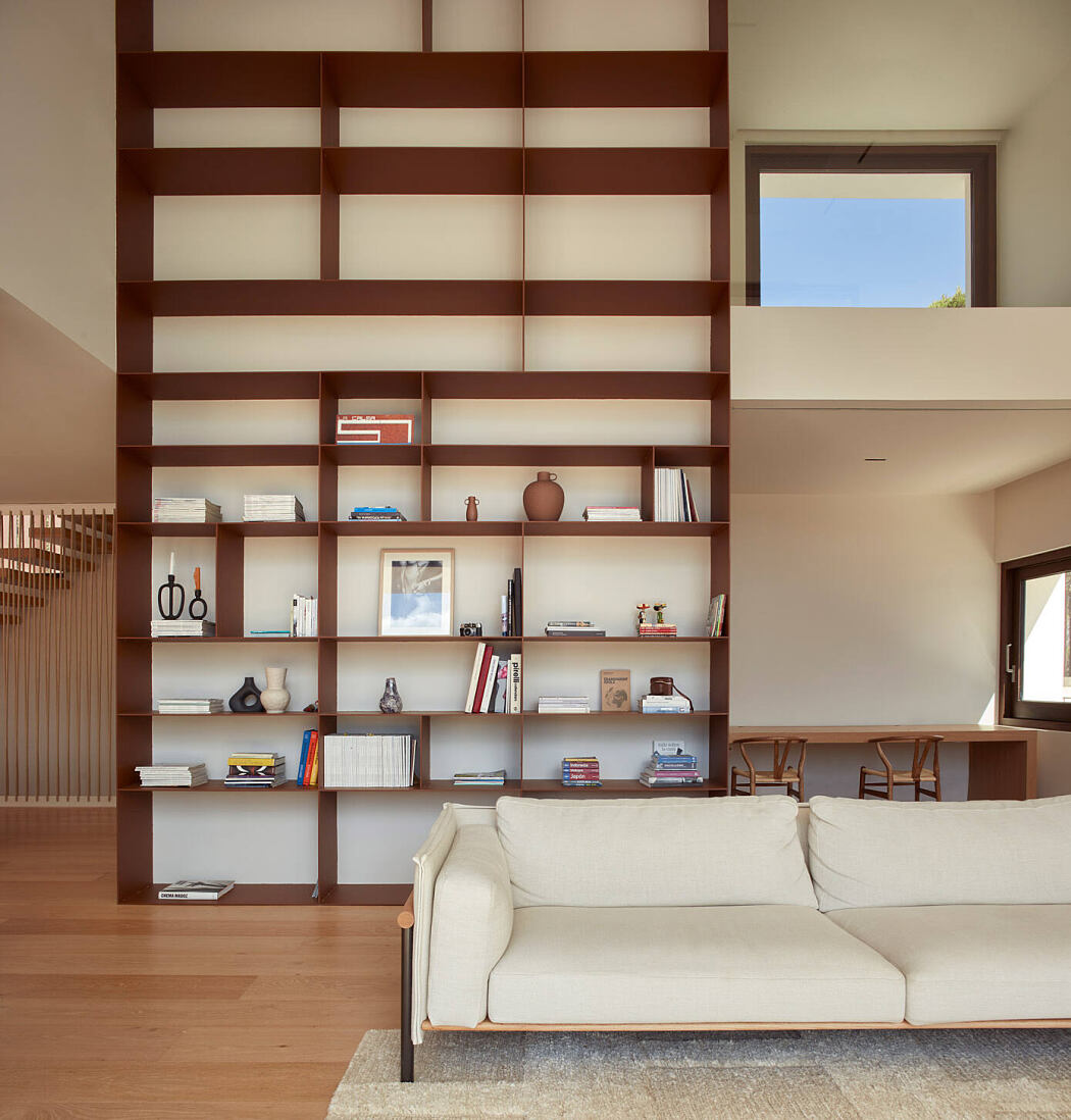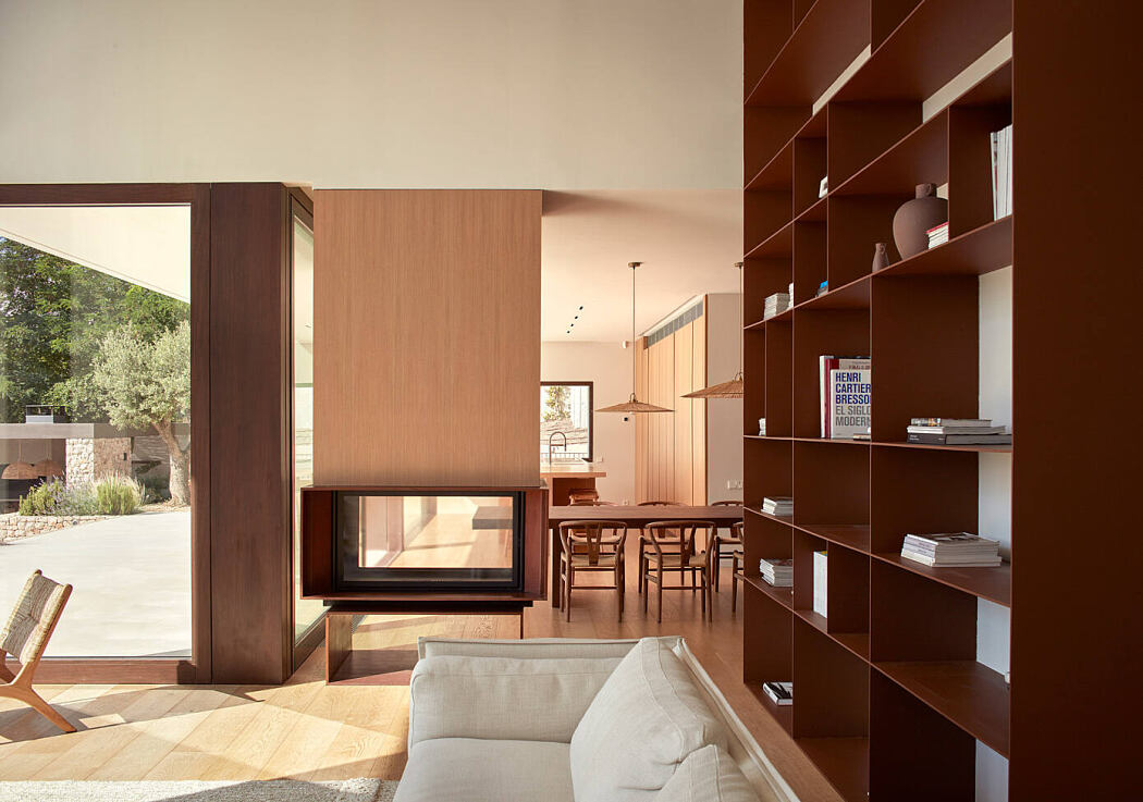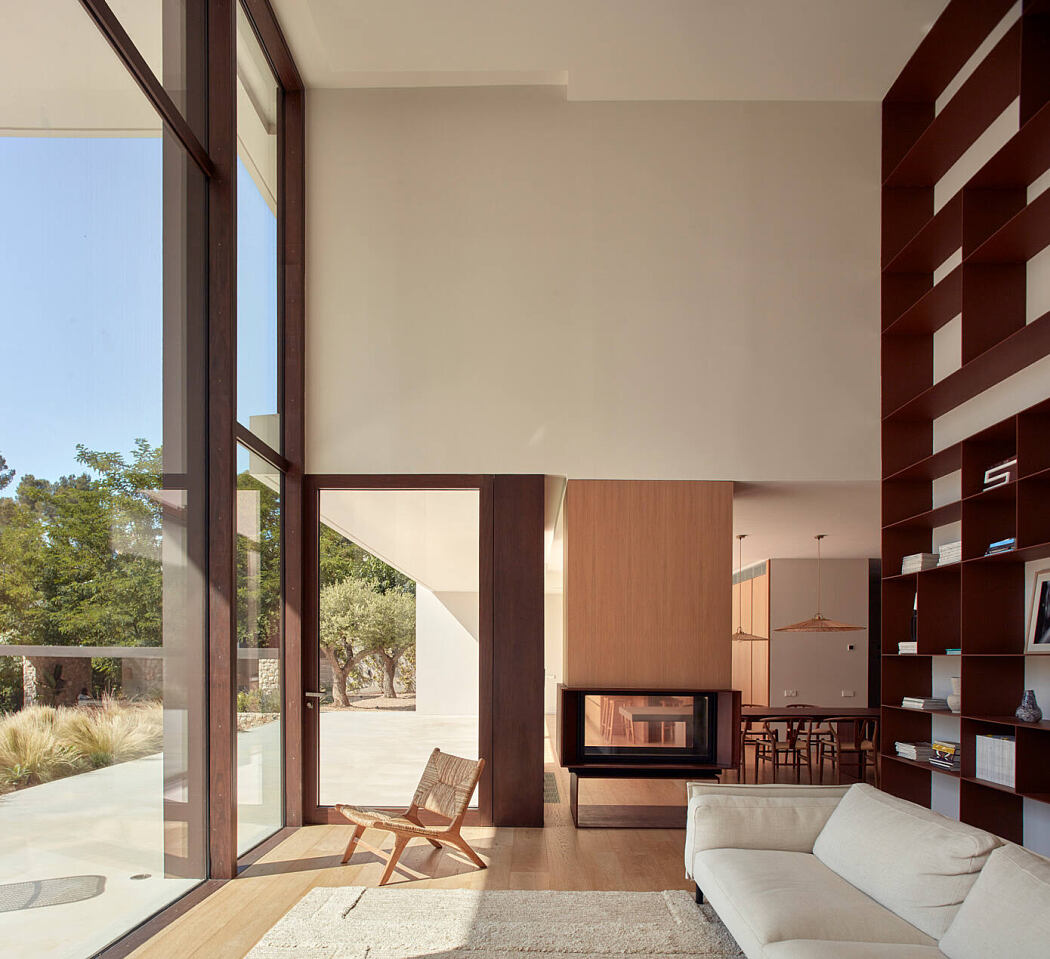 La Calma House has two levels. The day rooms are on the ground floor, fluidly organised, visually connected although they can be divided if needed. The double-height living room is dominated by a large bookcase and separated from the dining room by a double-sided fireplace. The bedrooms are on the first floor, where the sunlight and the views are controlled by sliding louvered shutters.