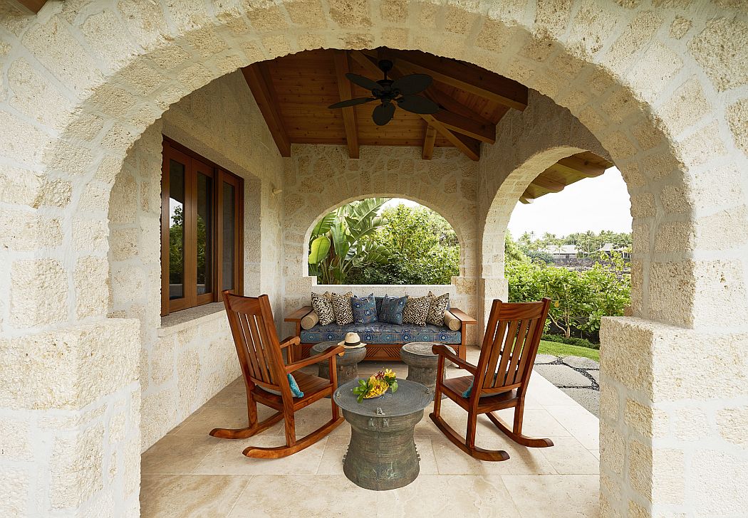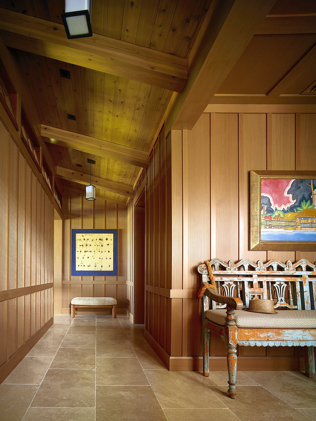 Transition spaces such as the entry, lanais, foyer are an important architectural element that in addition to providing shade to living spaces add considerable graciousness to the atmosphere of the home. Curved wood knee braces frame views from the living spaces, and are an iconic arts and crafts detail. The clients’ collection of late-nineteenth-century ship figureheads overlooks several of the common areas as if to provide guidance and protection for the residents and their guests.