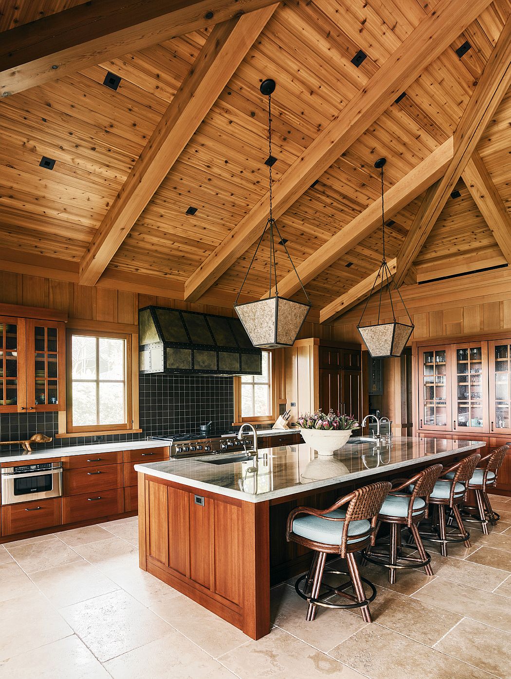The home’s entry vestibule is understated and compressed to a low scale with a simple cedar beam ceiling. The enlarged volume of the entry, with its timber-frame trusses, adds drama to the sense of arrival. The dining area, living area, and kitchen are casually grouped under one roof. A partial-height coral stone wall sets the dining area apart from the living area and kitchen.