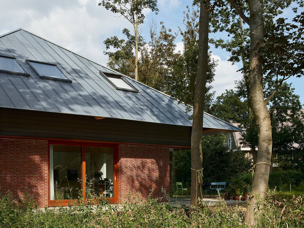 In order to make as little impact as possible on the environment, a modest roof shape without gutters has been designed. Due to the zinc cladding, it largely disappears into the sky and stands out sharply against the green environment. The timber roof beams continue outside, creating a kind of hat that protects the house against rain, dirt from the trees and heat from the summer sun. In the winter when the trees are bare and the sun is low, the solar heat does come in.