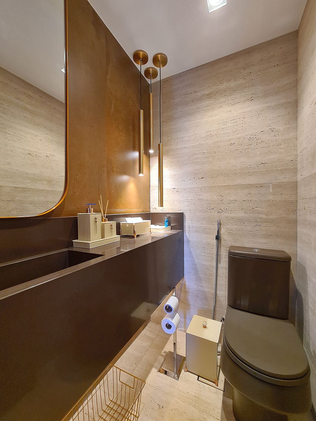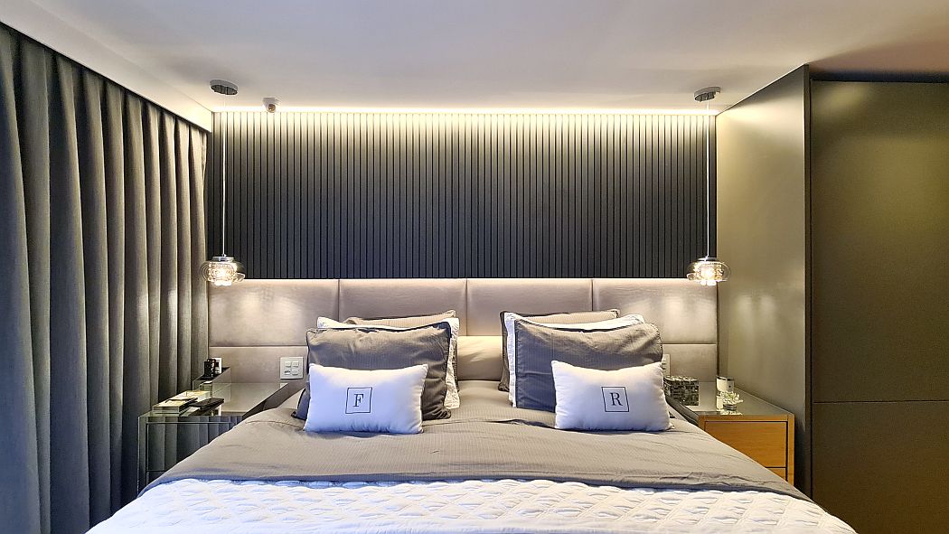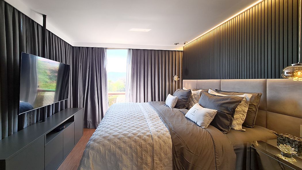 Very important for the clients, a young, cultured, sophisticated and fashionable couple, the spaces were designed using the High-Low concept so that the client could invest in what was really a priority. The professionals’ objective was to bring the privileged view to the warmth of the environment. For this, we used high quality floors and coverings, local and imported lighting items, glass and mirrors with a bold design, in addition to a metallic structure that expanded the living room and integrated the gourmet area, precious stones such as travertine, curtains and wallpapers that deliver unique personality to each environment.