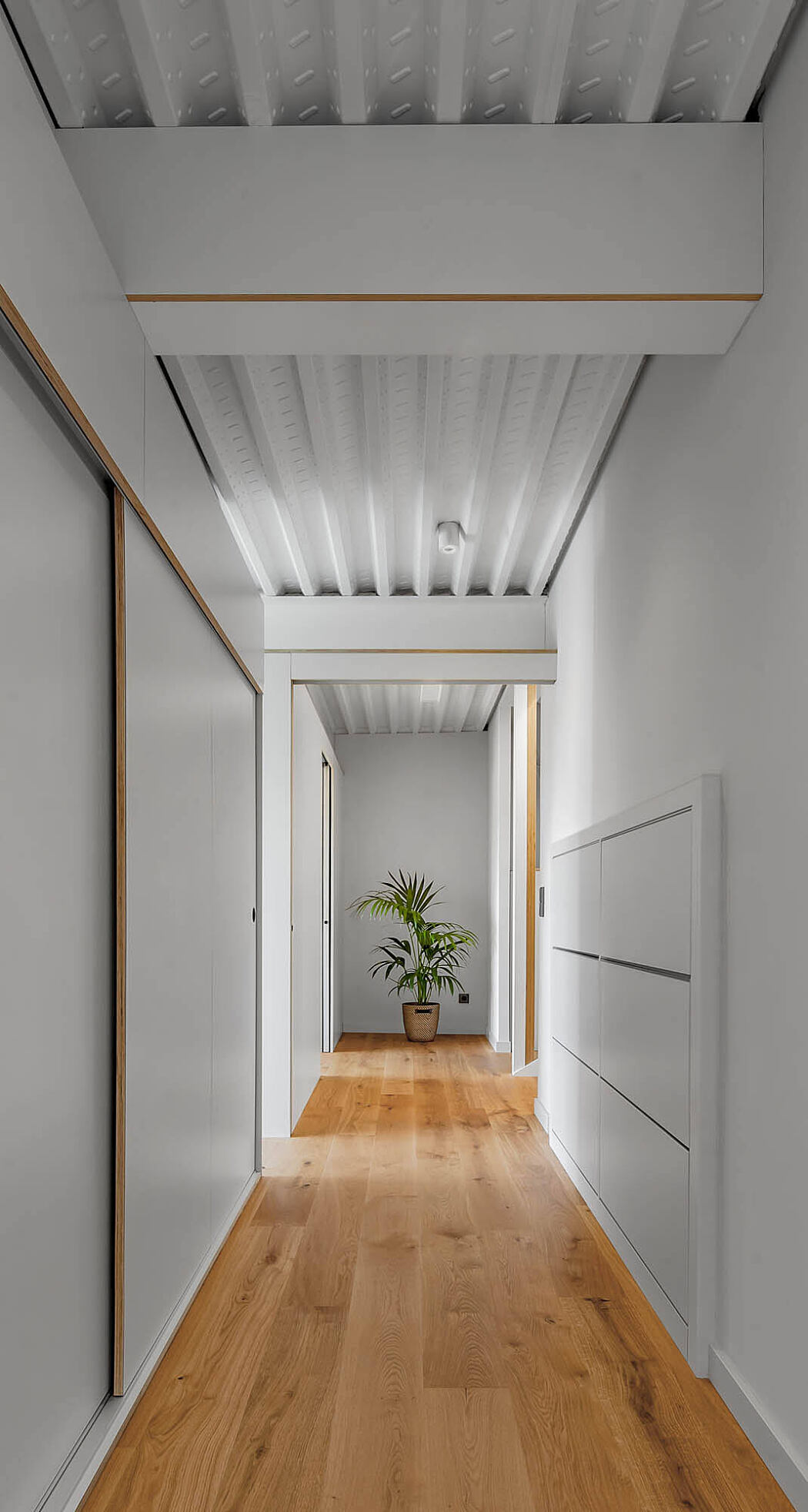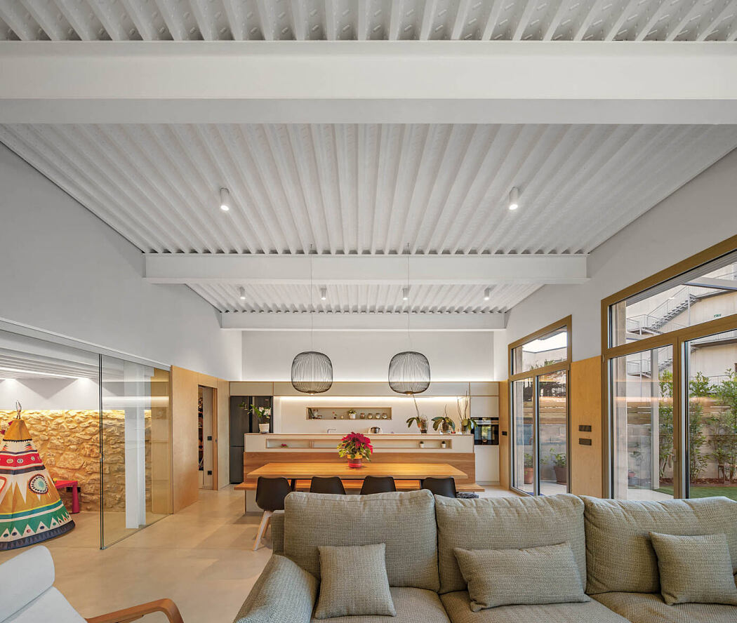 The sheet metal of the roofs acts as a light reflector, diffusing light from the facades to the interior of the house.