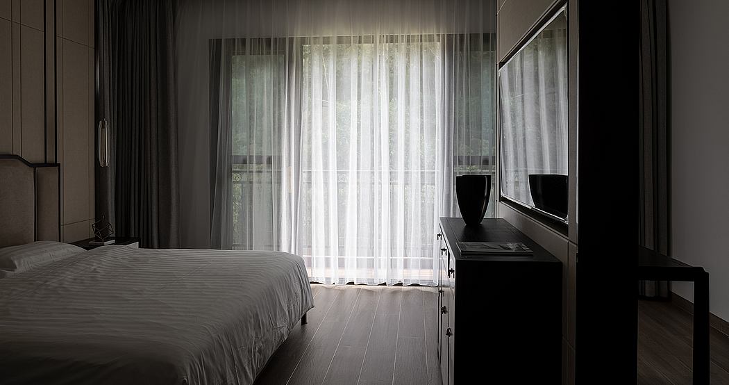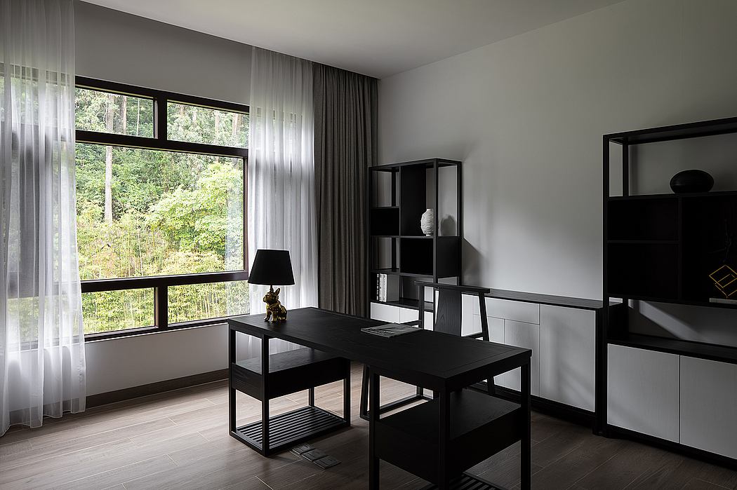 The master bedroom suite on the third floor dispenses with heavy decorations, bringing a natural and balanced sense of simplicity, and conveying the best state of human life. As the sun shines through the floor-to-ceiling glass windows to the study room, every single object and every material breathes in the same space, intertwined with each other, presenting the quiet and beautiful minimalist design. Located next to the mountain, the beautiful scenery of the outdoor landscape can be viewed from the bay window in the study room.