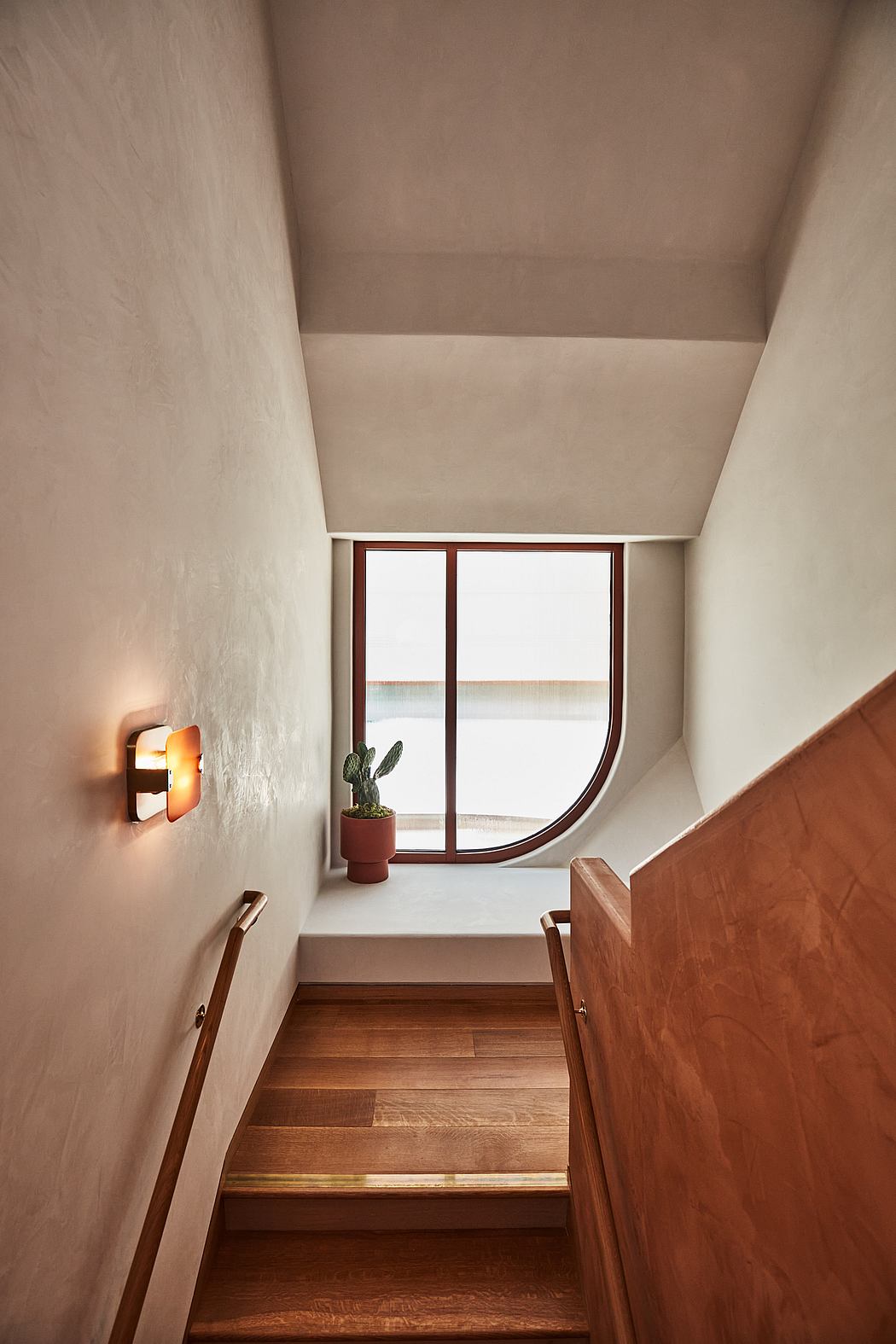 Upon entrance to the 48-room boutique hotel, guests are greeted within an intimate and tucked away lobby, which mimics a Mediterranean-like portico (or porch). Residential in feel, the hotel’s curved walls and central courtyard filters light through each of the hotel’s three stories, where the serene and inviting rooms provide guests with congenial and homely amenities as if staying in a well-curated residence.