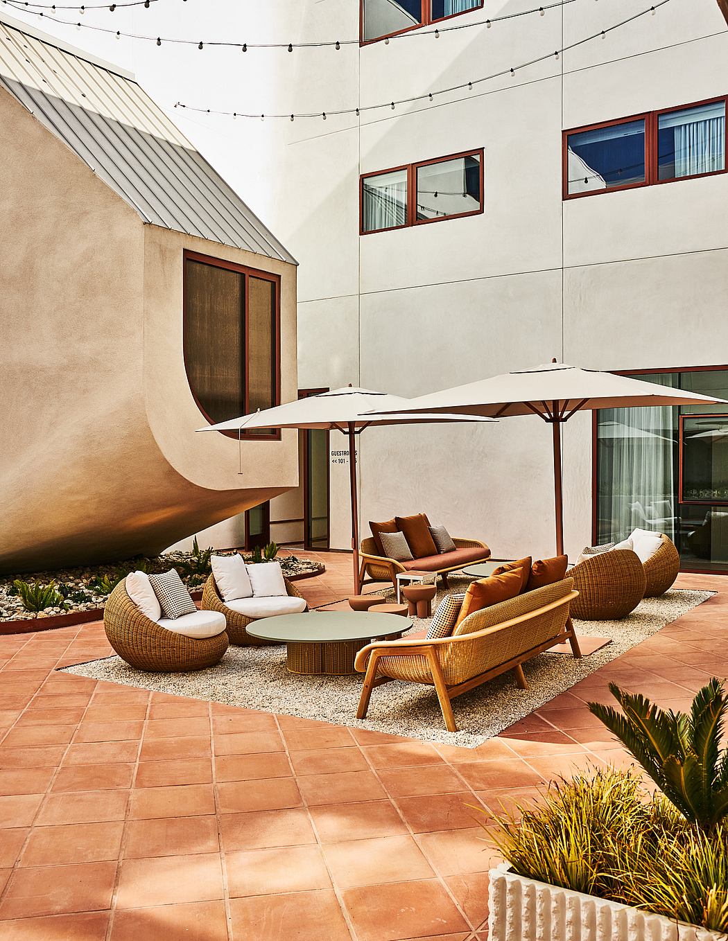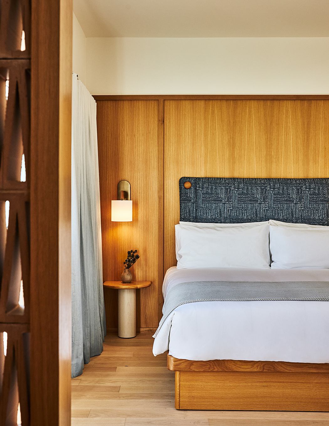 The hotel’s interior design highlights the power of visual storytelling, riffing on charming elements like soft curves, white oak ceilings and floors, and site-specific art. The sweet and layered details — including the eclectic use of vintage and custom Home Studios furnishing and lighting; fluted textures; Terracotta plaster; and warm wood materials — subtly reference California’s diverse vegetation and natural environment.