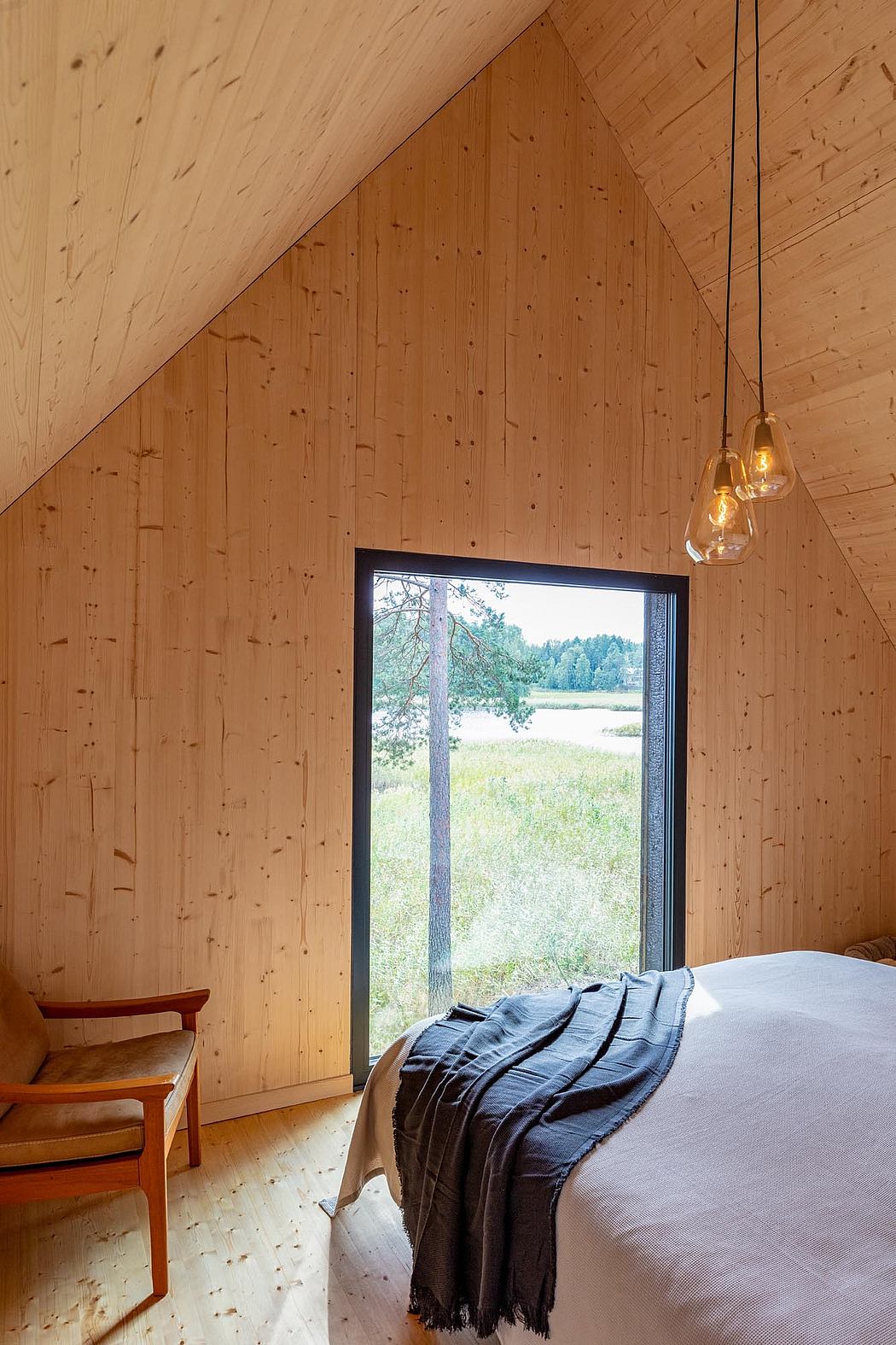 In the master bedroom, the ceiling can be reached, the windows are low. The feeling is most intimate and brings up memories from one’s childhood, you are hidden, on top of trees, in your own treehouse. The master bedroom is situated in a completely different corner of the house than the other bedrooms and can be completely shut away from the rest of the house by the huge sliding door.