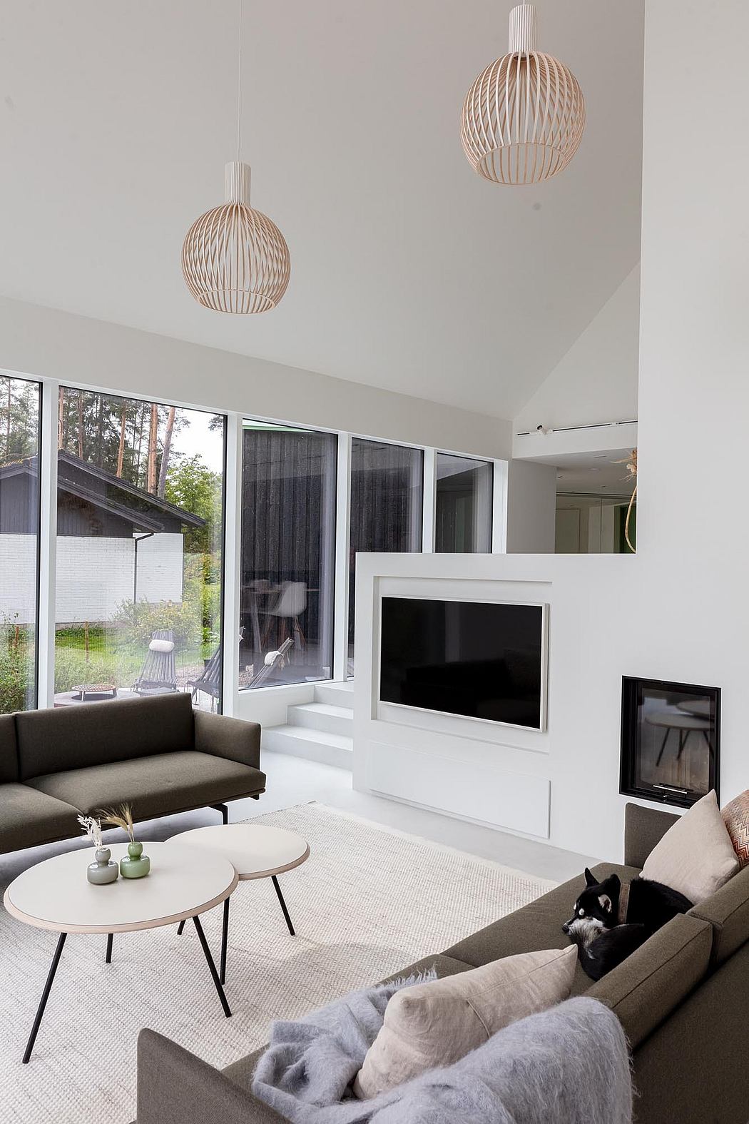 The hall is a comfortably low space, having the feeling of human scale and safety. From the hall, the ceiling rises higher into the dining area. There is a fireplace separating the dining area and the living room, and behind the living room, a big view to the waterfront.