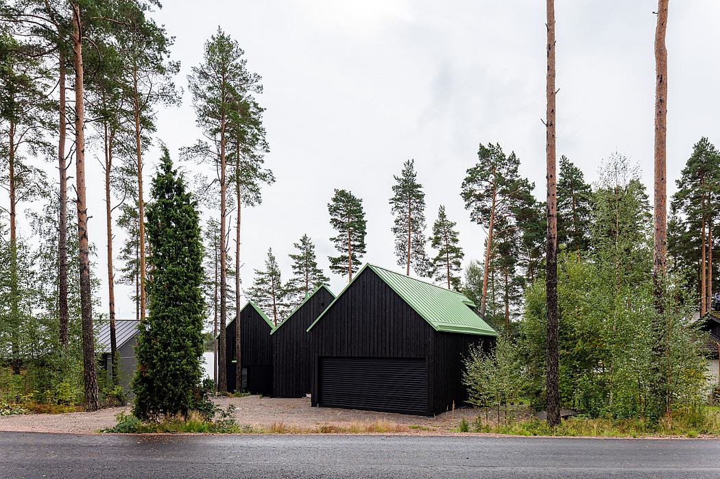 On a seashore, between pine trees, a house consists of three little, seemingly separate buildings. Their facade is wood, burned to char, and their pitched roofs a light green colour. Towards the street, there are very few windows, a garage, and the front door hidden in a corner between the two slightly larger masses.