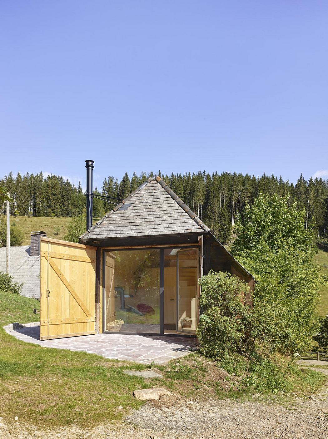The outer shell including the roofing was preserved. Only a few interventions, such as the bay windows in the facade, indicate from the outside that a conversion has taken place here. The existing openings, the large barn door and the wooden door on the valley side, now serve as shutters for the new generous fixed glazing with glass doors.