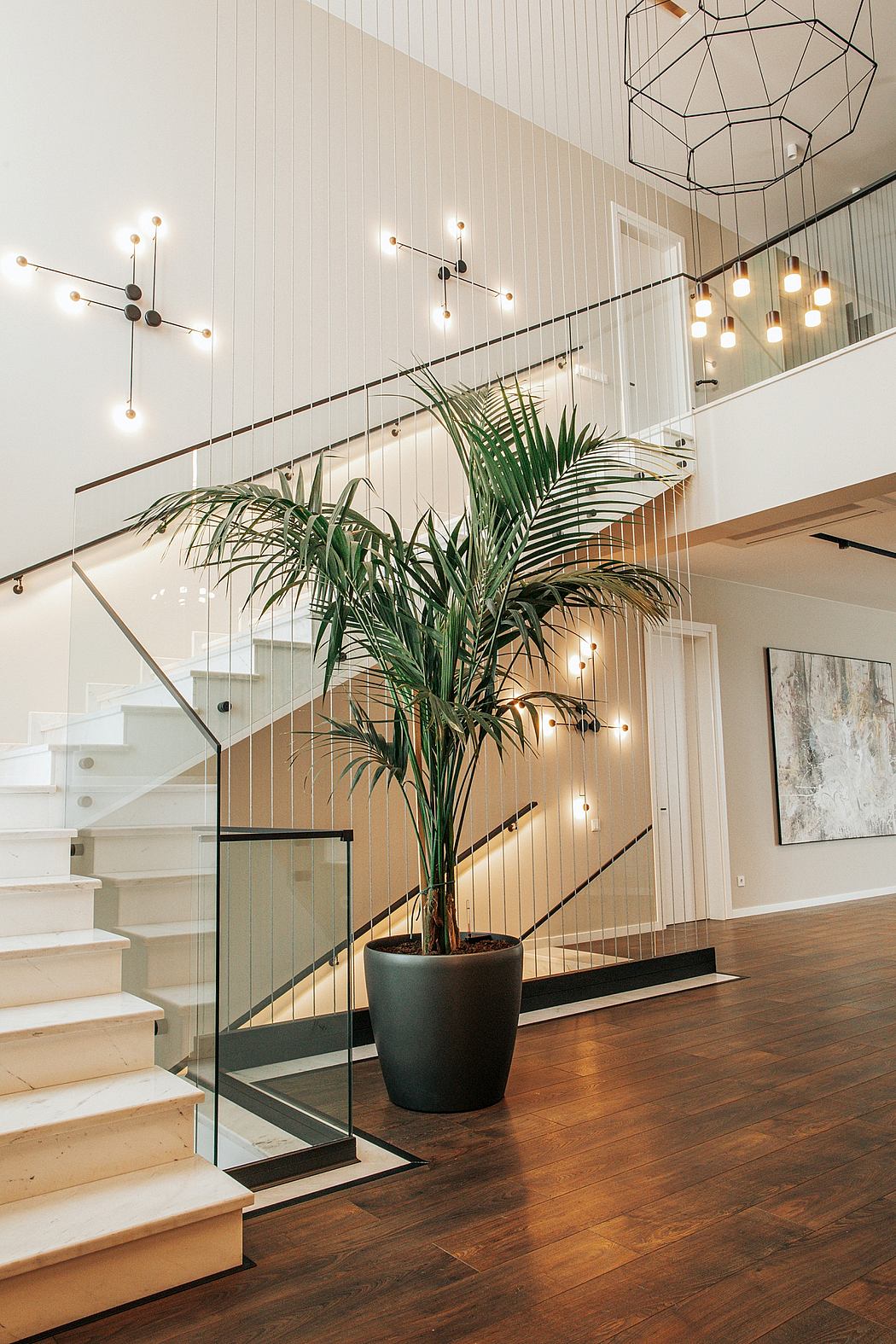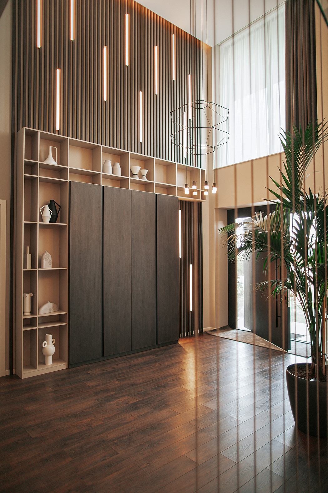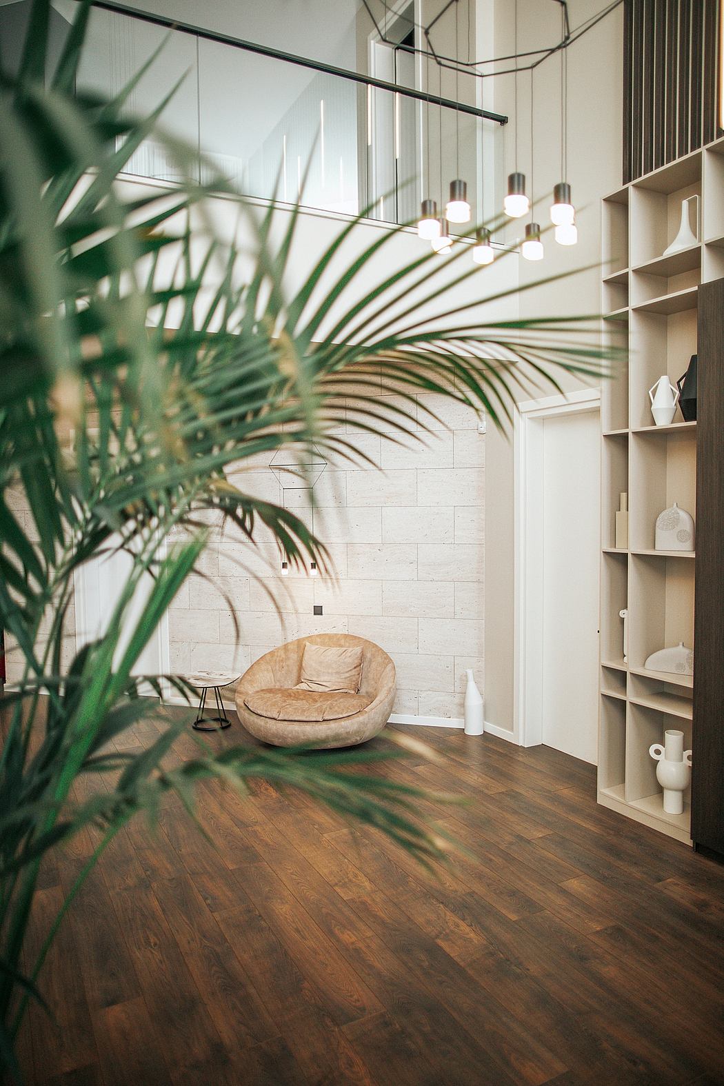 The Design Concept – Based on the individual needs of our client, we created an extraordinary design concept – an interesting synthesis of minimalism, warm tones, and colorful accents. To highlight the size of the space, we created huge wooden pillars that covered two floors. Then, we added some minimalist metallic lines that mimic the style of the main chandelier of the entrance. To get an interesting contrast and remarkable style, we cheered up the neutral-colored space with vibrant elements. Together with an artist, we also created contemporary and minimalist paintings that capture the colorful accents of the furniture. The interior of the Villa Saguramo is distinguished by the set of decorative lighting, which on the one hand, is functional and further, makes the space more dynamic. And the last chords of the interior are the huge plants that make the space more comfortable and more lively.