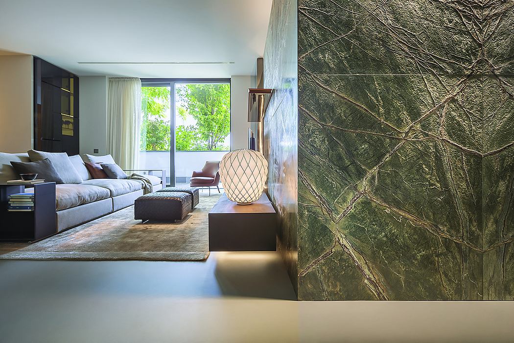 Among all of them stands out the Forest marble chosen to cover the wall that crosses the apartment longitudinally and connects the living room with the other rooms of the house, hiding the accesses.