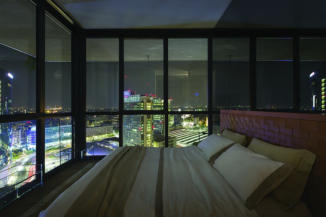 The exterior-interior connection is also created through reflection, used to break down corners and create continuous cross-references between inside and outside, as in the case of the master bedroom that overlooks Milan with full-height windows. A glass lantern for which Panzera has chosen large black and mirrored surfaces that reflect the city, enveloping the bed with the lights of the metropolis and making the architectural box disappear at night.