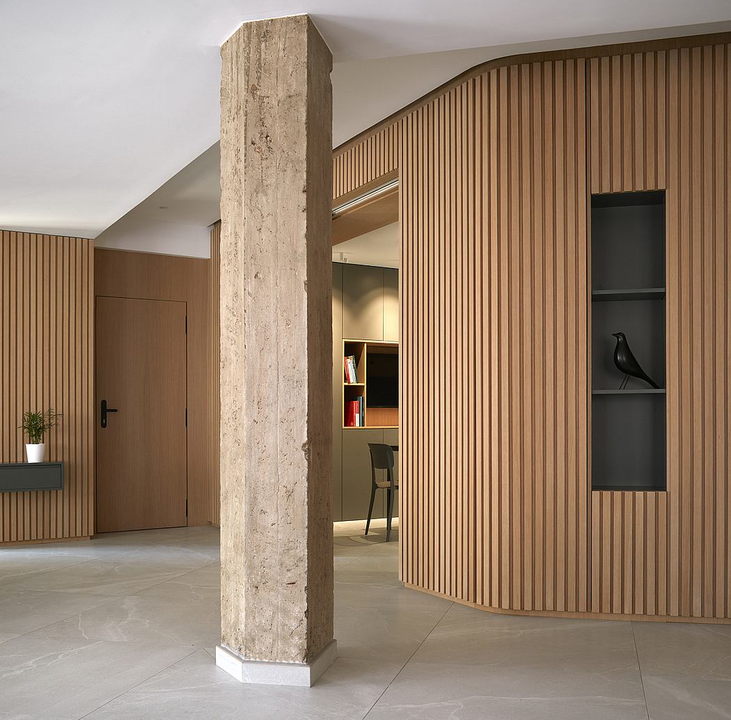 The most important point of all our interventions is in the living/dining room, where these two directions converge. The solution has been to design a natural oak wood-paneled curve, which dresses and gives character to the whole space, making it the real protagonist of the entire renovation project.