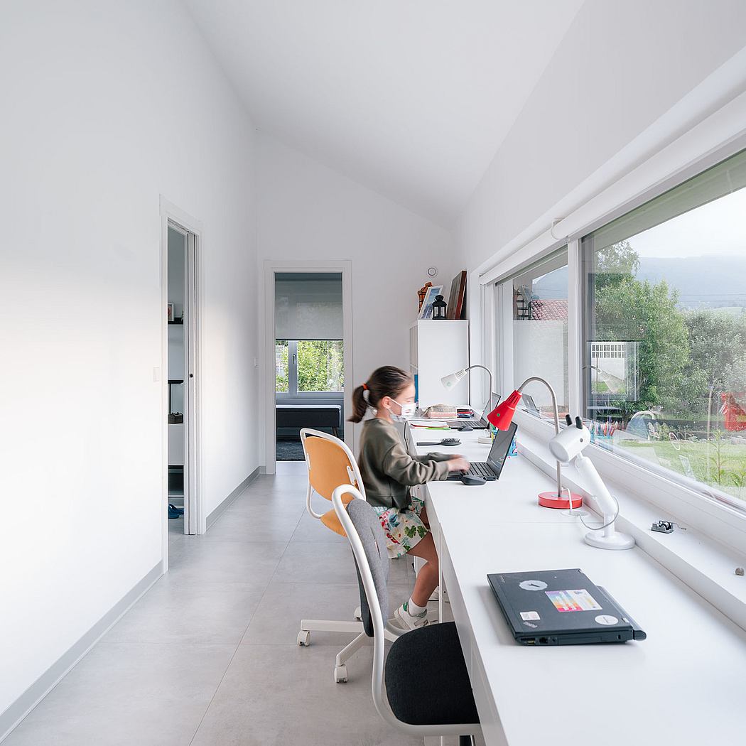 The house is organized on a single floor with three gabled volumes connected to each other. The central volume houses the main access to the house and it contains the living room, dining room, and two terraces. In the south volume, three bedrooms and a bathroom are organized. Access to them is through a corridor that is at the same time a study space. The third volume includes a kitchen, utility room, and garage. These three uses are concentrated in a wing that is attached to the main one, serves it, and defines secondary access to the house.