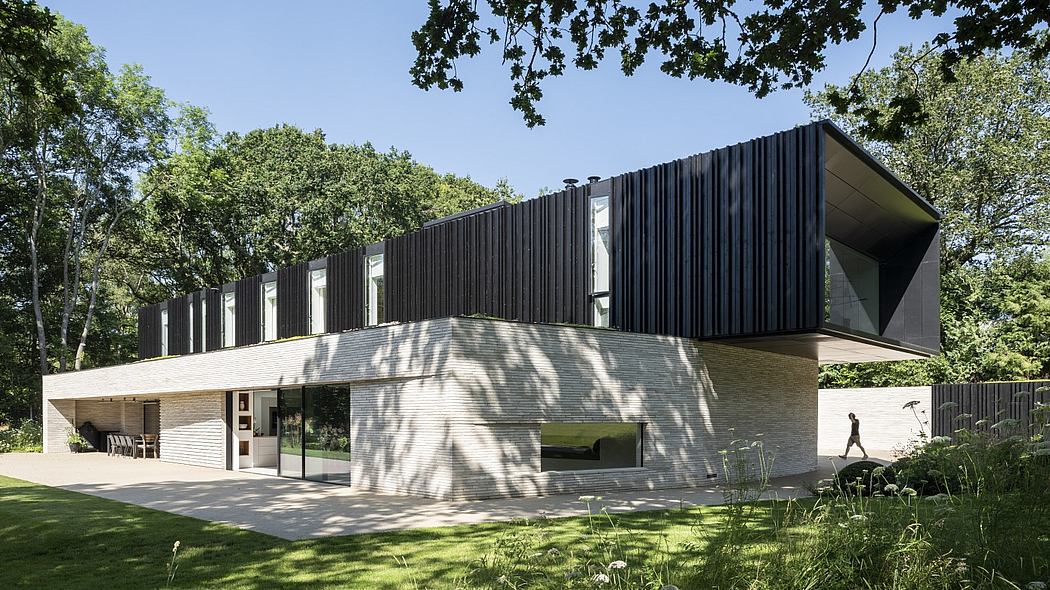 Drawing inspiration from the nearby historic brickworks and clay pits, the earth-bound ‘plinth’ is formed from a pale-colored, long-format brick. Chamfers and deep reveals express the depth and solidity of the ground floor, which contains the main living spaces, garage, and pool area. A ‘lightweight’ slatted timber-clad form supported on the ‘heavy’ brick plinth, contains the bedrooms areas and annex. This element emerges from the trees with gaps that open in the slatted timber to reveal windows on the east and west façades. The timber slats are arranged in a rhythmic pattern designed to mimic the vertical trunks of the trees in the woodland opposite.