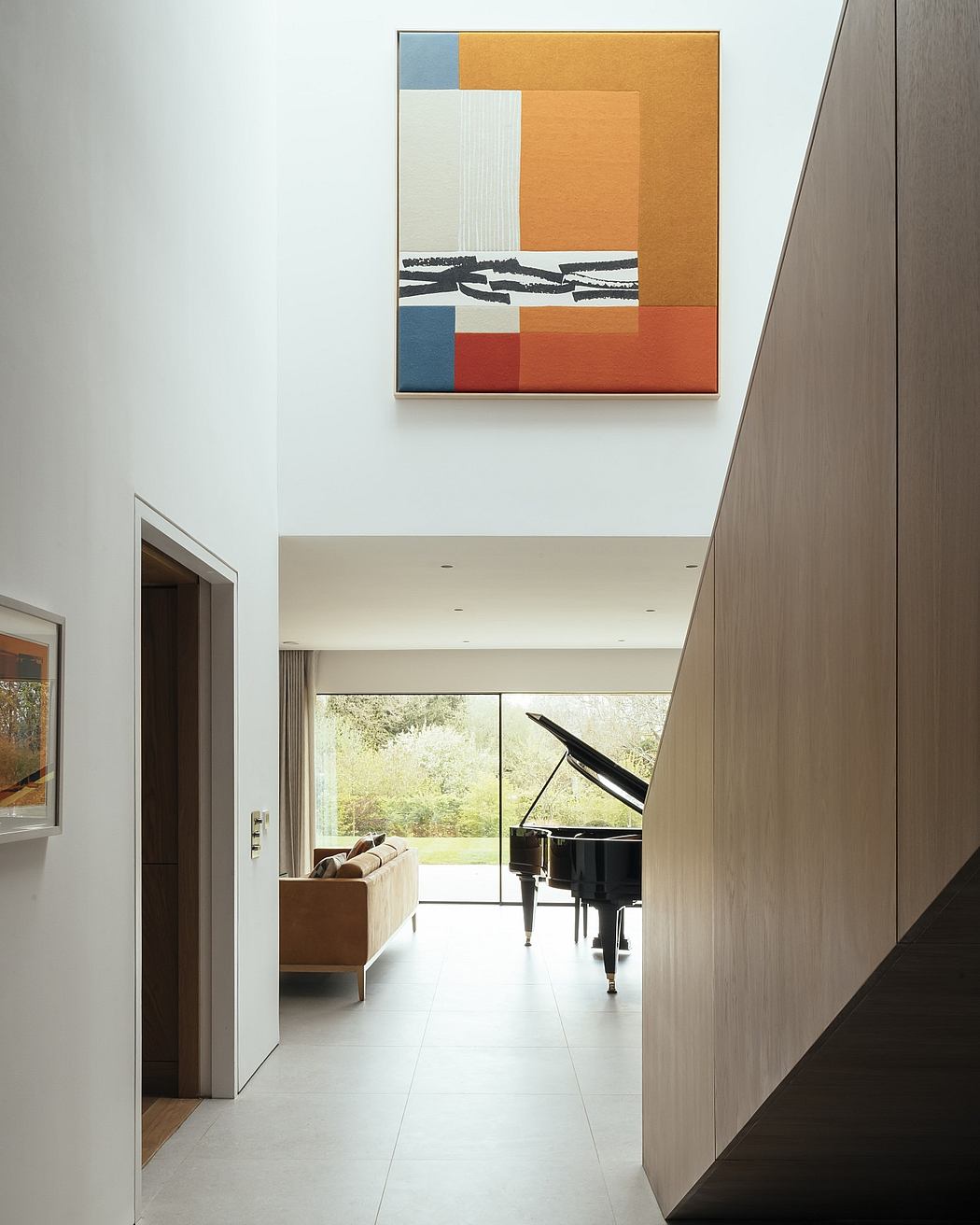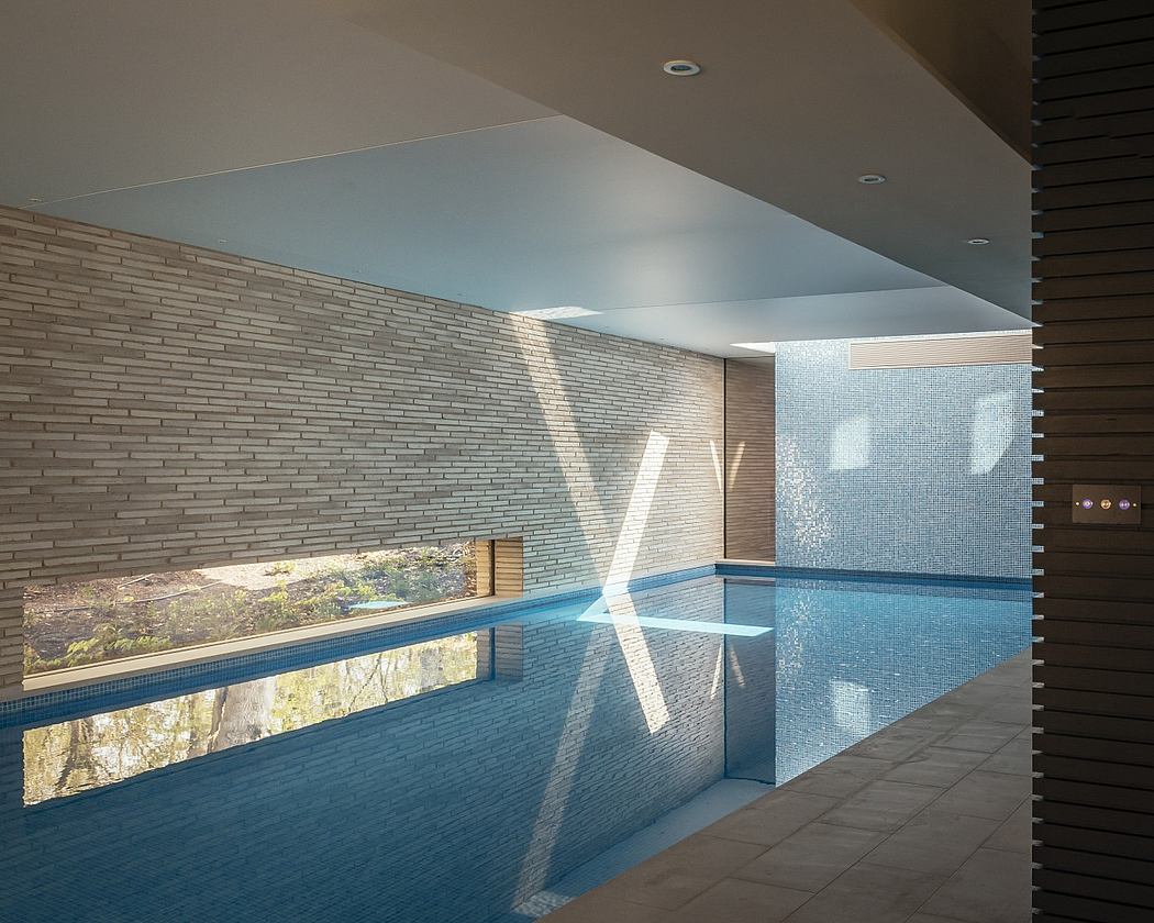 Jo was keen to use her love of swimming to keep fit and healthy. The pool at 14m long is sufficient for her to swim lengths but also wide enough for the family to enjoy socially. A resting point with a long, low window at eye level is provided along the length of the pool.