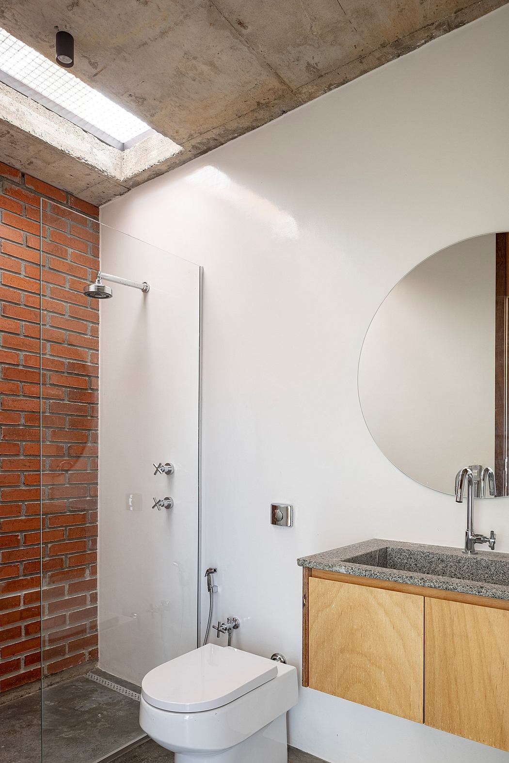 The structural system of both buildings is composed of two parts that were built independently: the exposed concrete structure and solid brick walls – the “core”- and the glued laminated wood (Glulam) roof. The aim was to combine local labor and traditional building materials with a large lightweight structure made from reforestation wood, remotely prefabricated, and assembled on site. The concrete and brick core follows a grid that allows for irregular variations in internal dimensions for the distribution of the program. Some parts of the fixed furniture were added to its own structure (such as shelves, grandstand and cabinets of the studio and kitchen, exterior stove, and internal bench of the house). The wooden roof follows a regular structural pattern. The two parts of each of the buildings are structurally independent so it was not necessary to obtain a high level of precision in the local phase of the construction to obtain the perfect “fit” between them.