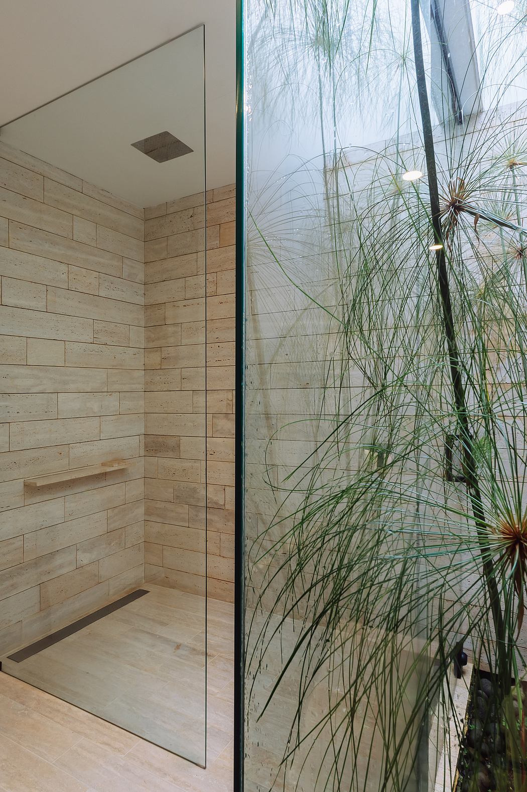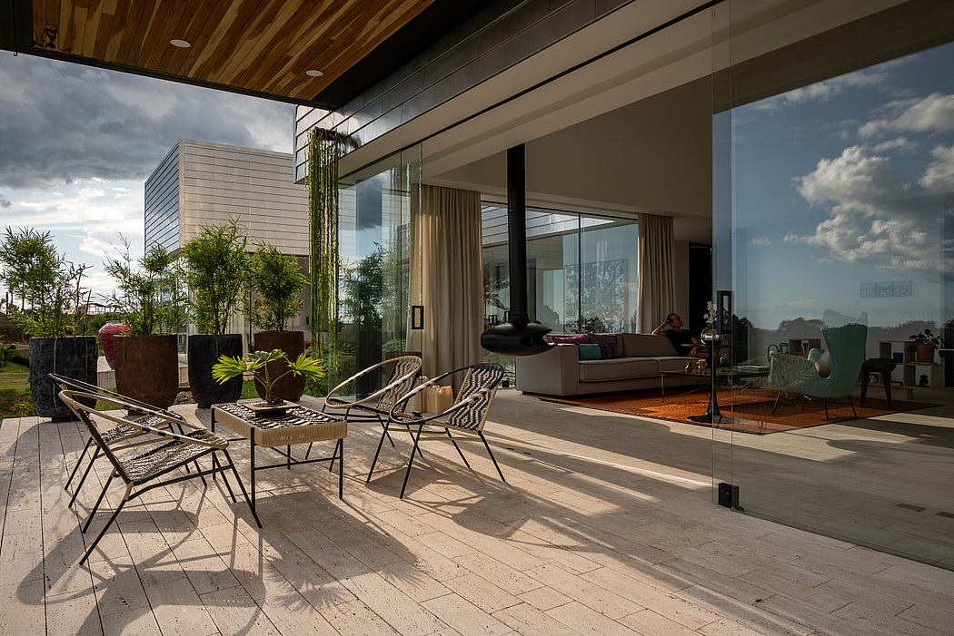 The material palette is simple but quite innovative. It uses a combination of traditional Colombian brick and introduces for the first time in the country of Colombia a Stainless Steel Shingles Facades. The metal façade and its mirror-like effect reflect not only the greenery of the adjacent forest but the vibrancy of the orange sunsets of the tropical climate, making the house feel quite distinct at different times of the day. The travertine flooring used throughout all the spaces of the house constitutes an homage to the work of SOM, and its open joint setting strategy delivers a very interesting visual effect.
