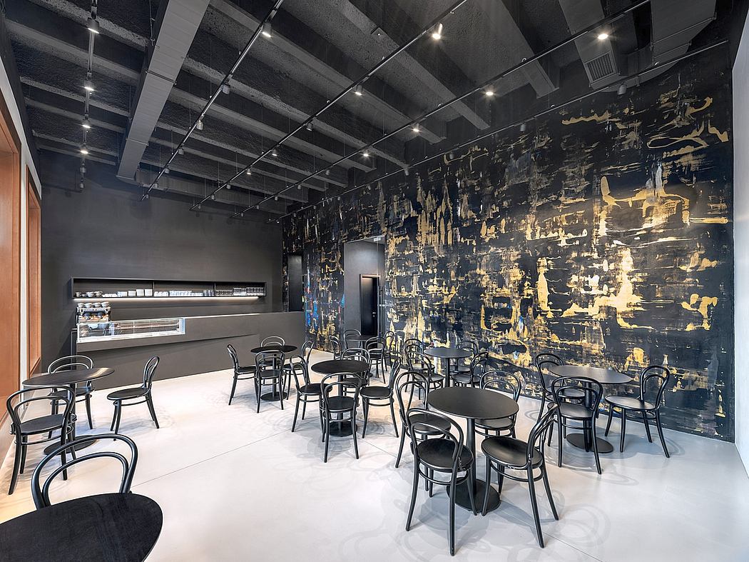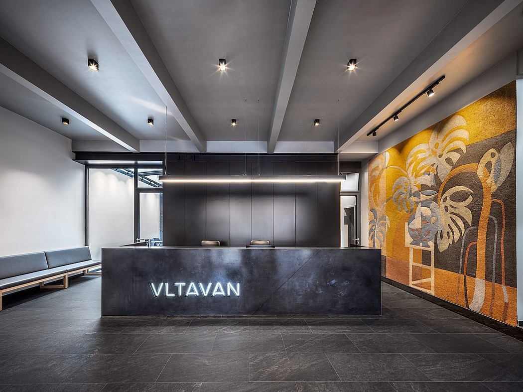 The new entrance hall includes a restored inlay by Bohumír Matal. In addition, there is a mural by Patrik Hábl in the new café facing the square (with a plan to modify one section of the public space for outdoor seating in the future).
