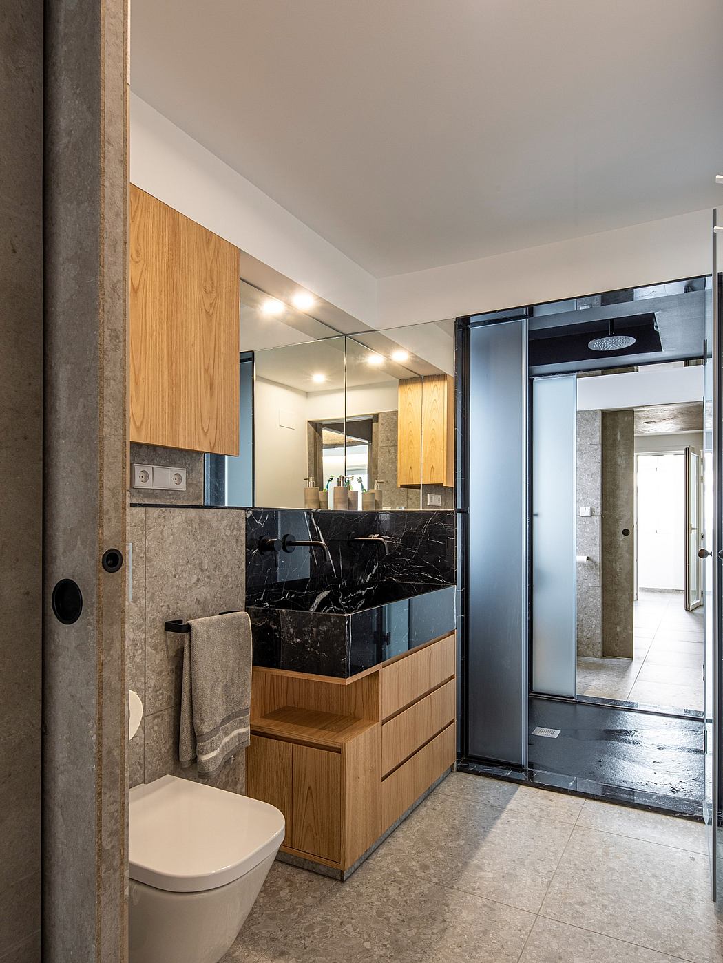 Where there is water there is black marble. Quiet, but not absent. The kitchen, also black, is the background of the background, at the back of the main room.
