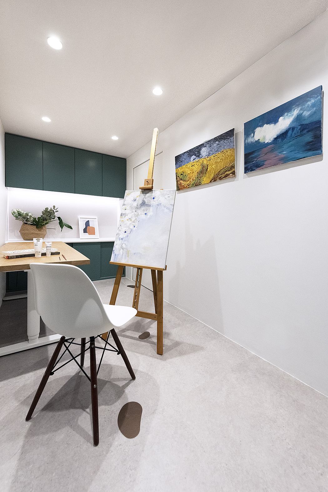 Various bespoke joinery has been spray-painted in a green lacquered paint to inject some colour into space. A long white wall has been created as a gallery to display the doctor’s paintings, accentuated in the space with exhibition-grade lighting.