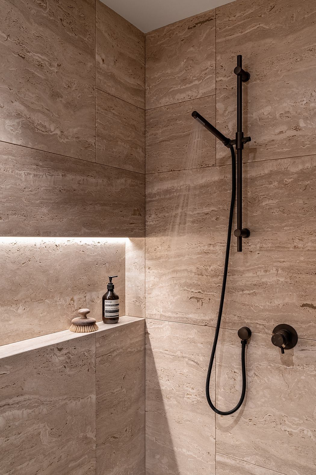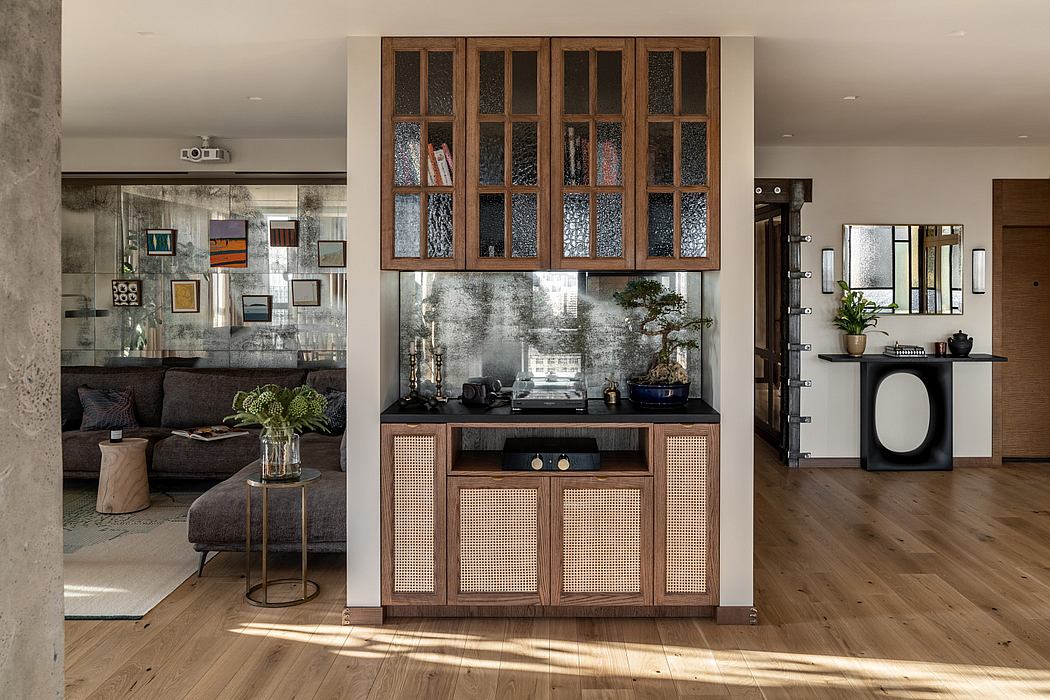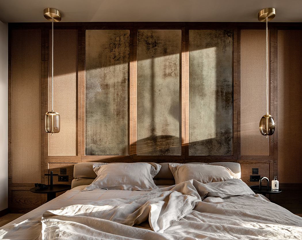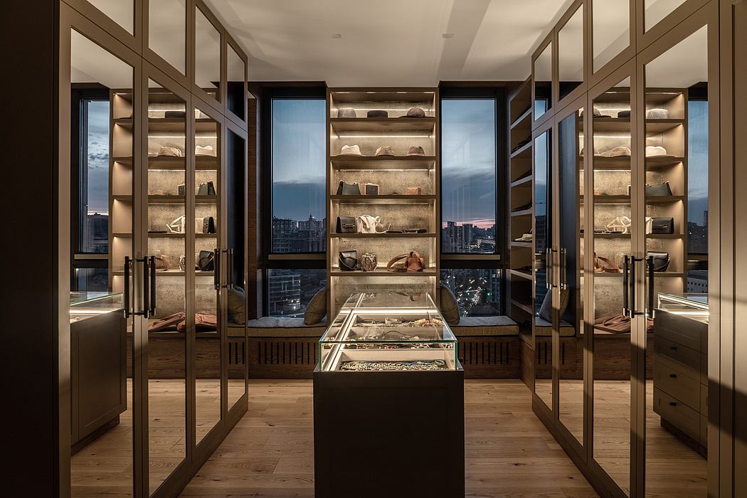 The private section of the flat includes a master zone, a guest room and laundry. The bathroom is completely clad with travertine which makes an intricate stone pattern while the mirrored cloakroom that creates the effect of infinity has, in its centre, an ornate island presenting a show-case for jewelry. Wall-boards behind the bed head are made of aged mirrors that cover a storage system incorporating integrated seats arranged in the windows and lighting fittings for reading. The natural materials, dim lighting and dark ceiling of the bedroom invite to its main function of rest and refreshment.