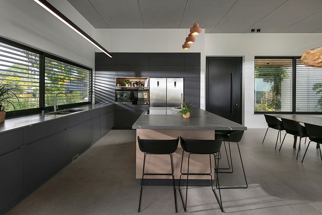 This young family’s property was planned and designed to co-exist with its surroundings. The interior space was designed as an open plan that includes a living room and kitchen both overlooking the breathtaking hills of Ramot Menashe, which are abundant in vineyards and orchards. It appears the outdoors and the indoors blend into one, inviting this stunning view into the property. The interior was designed in clean modern lines with touches of international flavors, while the external wood cladding and the cedar tree pergolas connect the property to the rural feel that characterizes the entire area.