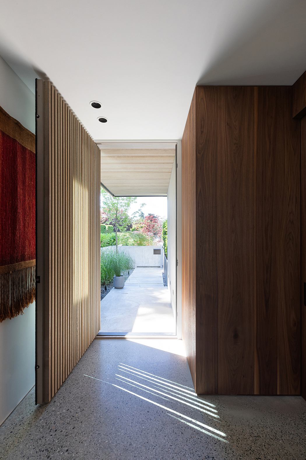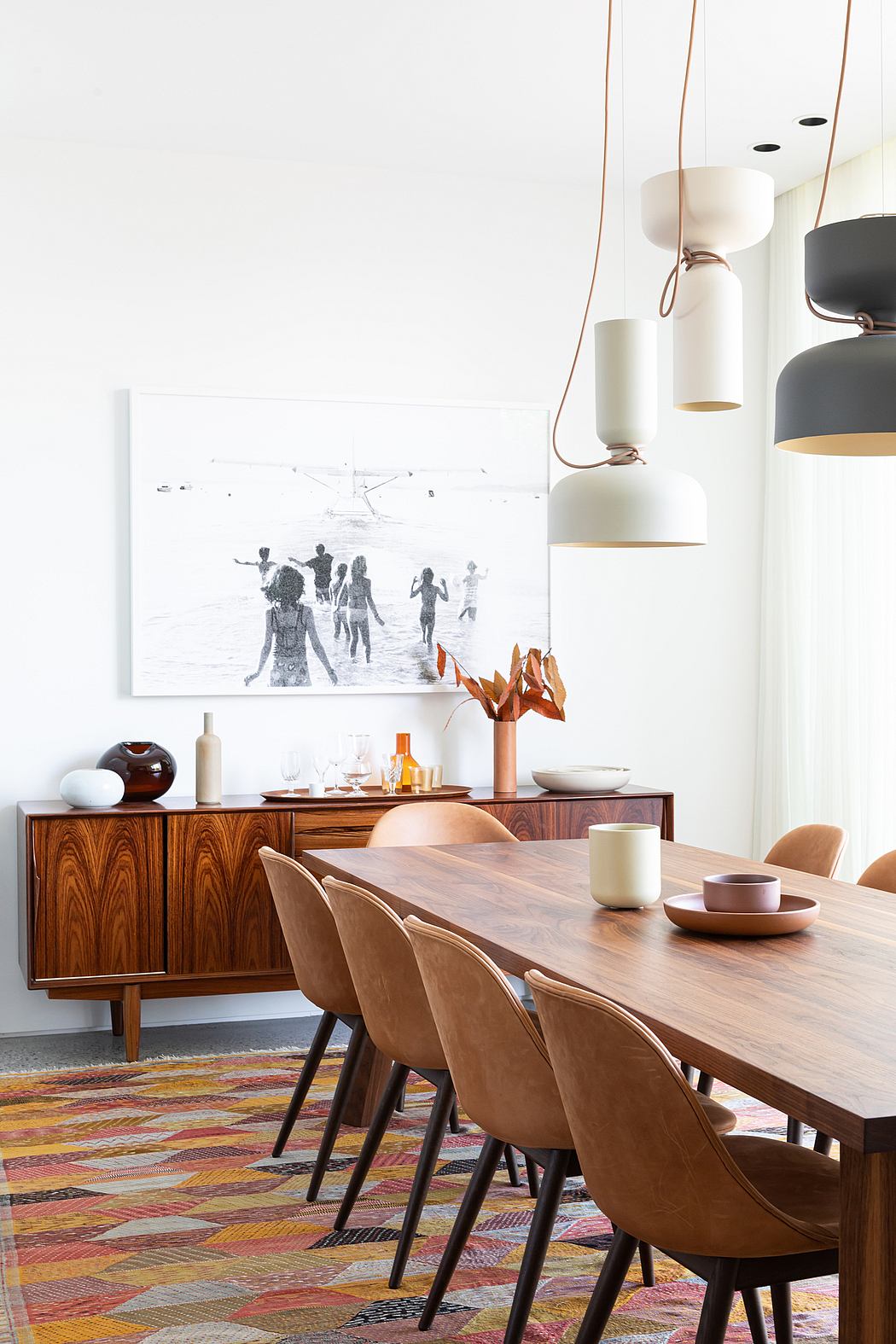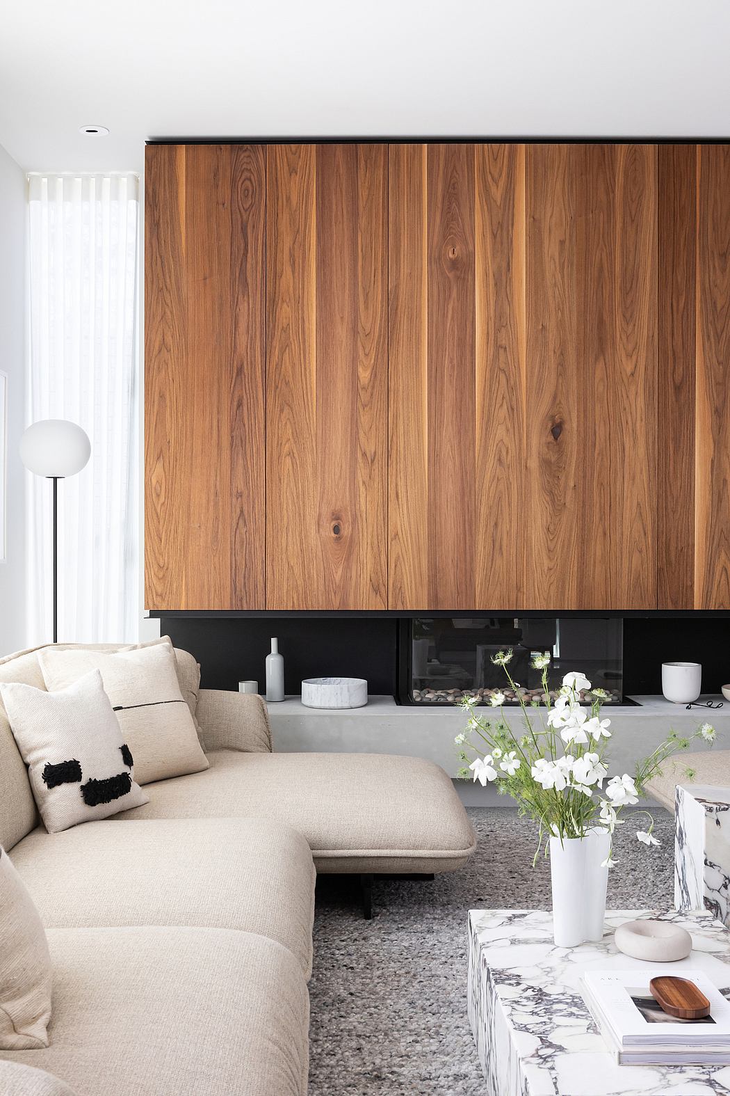 Brushed walnut millwork is found throughout the home, as well as concrete aggregate floors. Wool and leather furnishings are framed by the flowing linen sheers. The rugs were hand-selected by the homeowners on a trip to Morocco during the build. Everything was chosen not simply for purpose, but also for ease of living and to marry with their existing textiles, art, and decor.