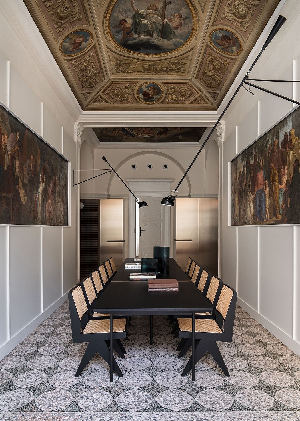 The apartment, now totaling 600 square meters, was created by the union of several portions. One of the nineteenth-century, historic layout, characterized by generous glazed openings, antique wood and seeded floors, and a pictorial and fresco layout in what was once the family chapel and noble rooms. The other of the elevation of the early 20th-century portion, featuring large rooms but lower ceilings.