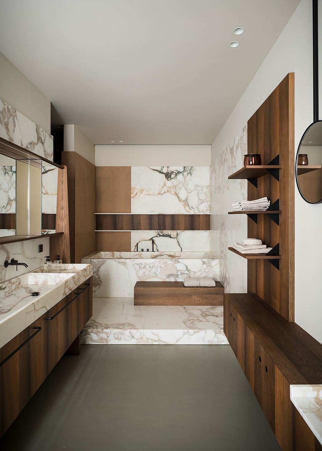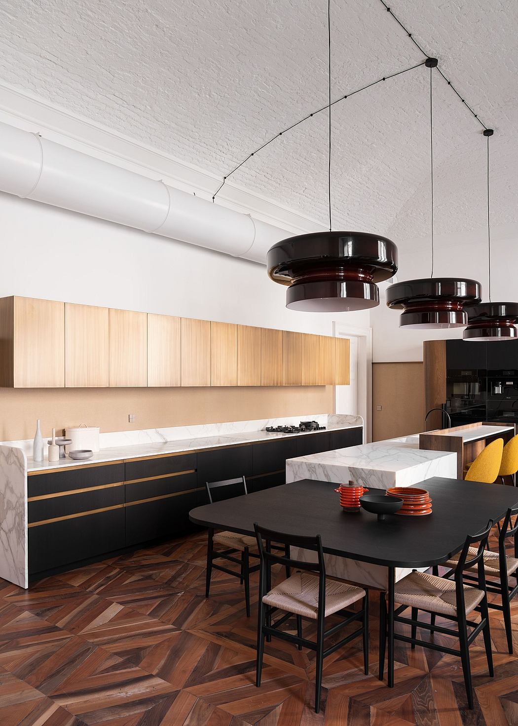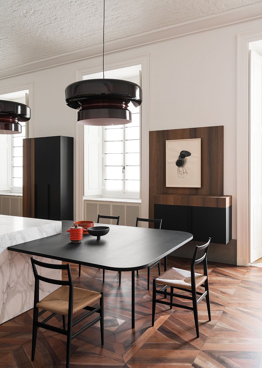 The whole project plays on the intrinsic characteristics and messages evoked by the materials and colors themselves: wood gave elegance, fossil oak authenticity, black contemporaneity, slender legs and shapes lightness, bronzed metal preciousness, always in continuity and never in antithesis with the pre-existences.