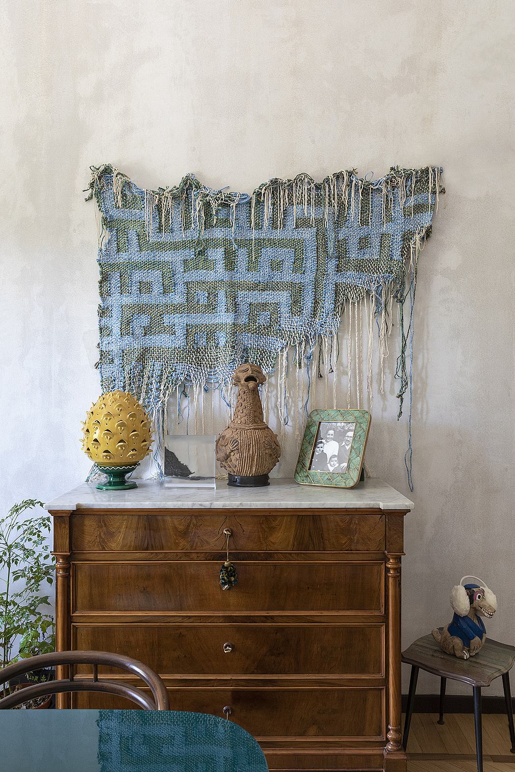 An arched passage with a custom-made bookcase leads to a more intimate dining area. Here, neutral tones on the walls provide a theatrical backdrop to the family’s antique furniture and works of art (tapestry by Igshaan Adams; Classroom by Pascale Marthine Tayou), while the Illan birch pendant lamp by Luceplan rests on a glass-surface table with vintage ‘50s chairs in a continuous dialogue between ancient, modern and contemporary.