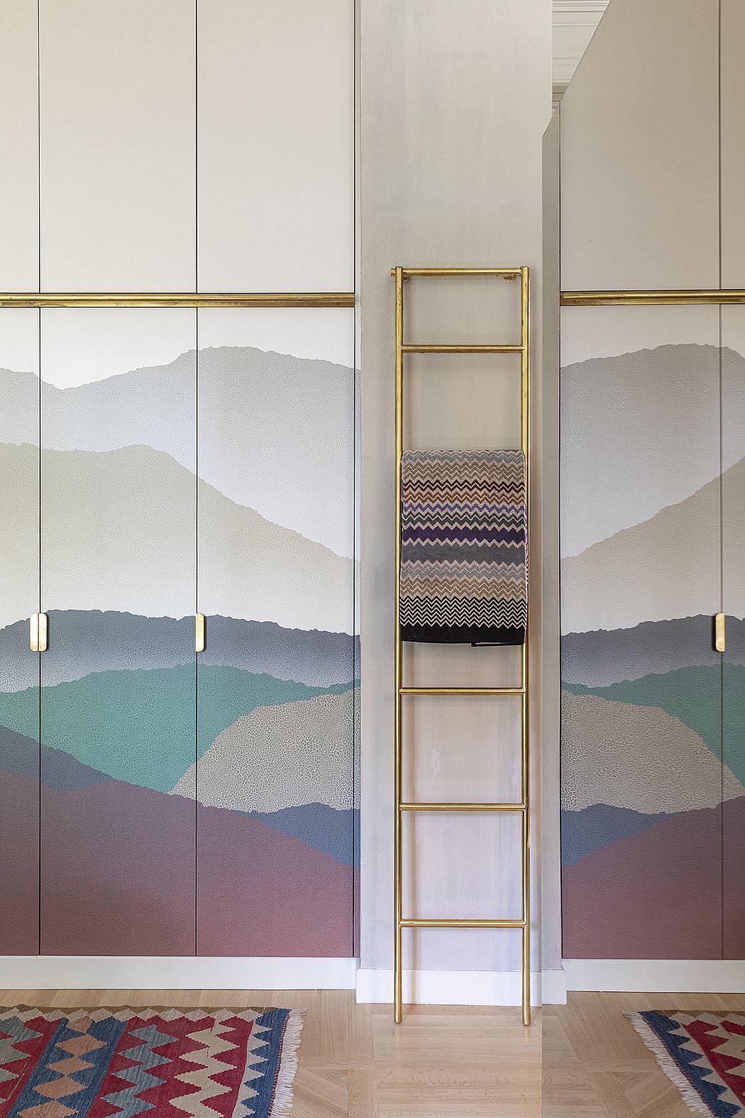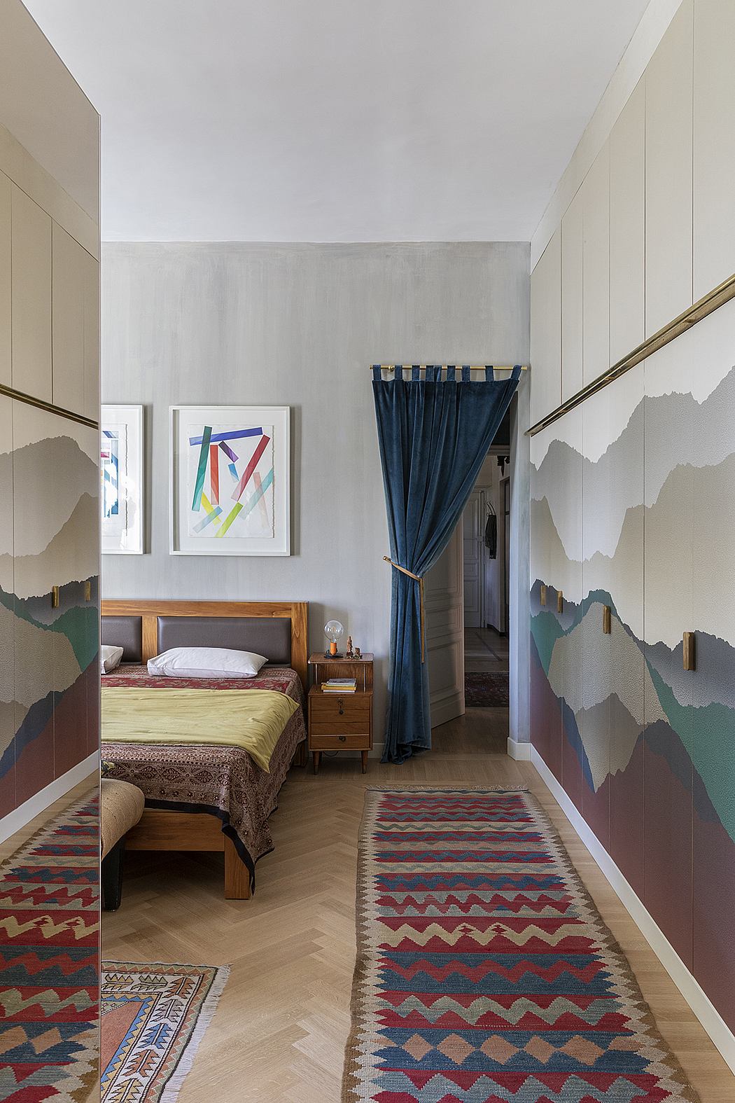 A cobalt blue velvet curtain reveals the heart of the apartment: the bedroom with a private en suite bathroom divided into several spaces. The horizon of warm colors of Ukiyo wallpaper by Nobilis on the doors of the made-to-measure wardrobe blends with the immaterial cubic volume that hides the bathroom services. Thanks to the layered glazing resin of the decorator Franco Casi Melcarne, the environment finds its own visual and formal unity from which the bathtub and shower area of the bathroom take shape.