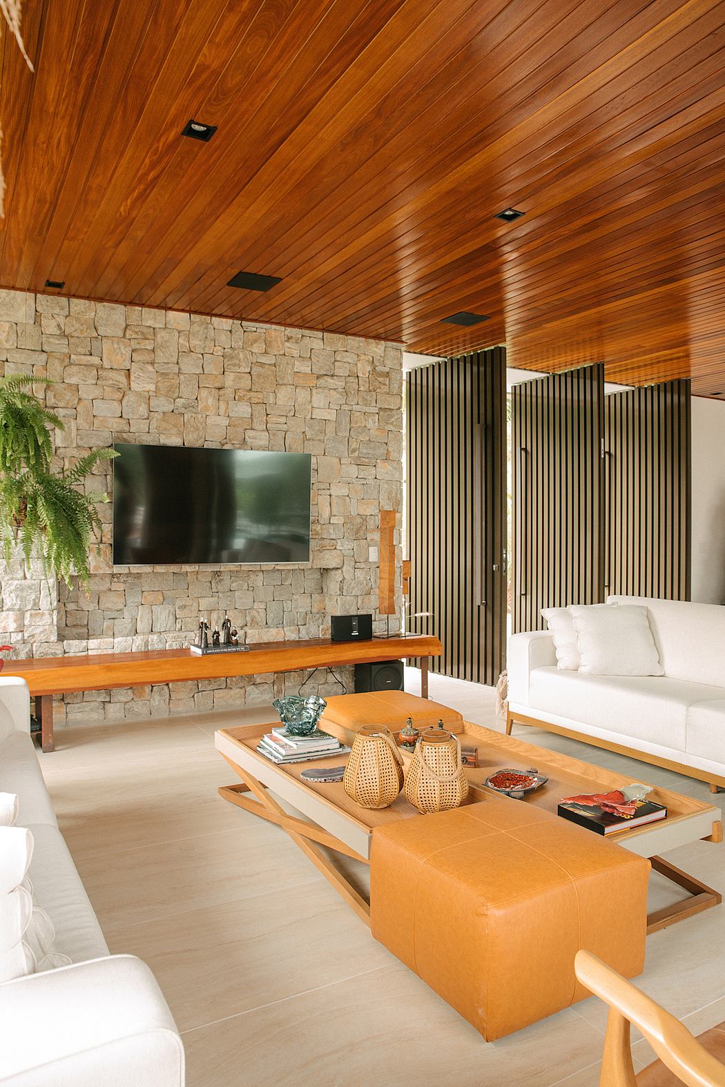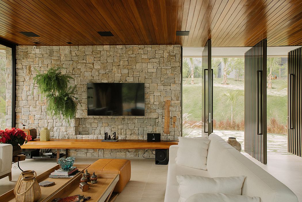 The common areas of this project have a hybrid feature that combines aspects of the external and internal areas, integrating with the pool area. The sliding doors are fully open, making the room look like a balcony.