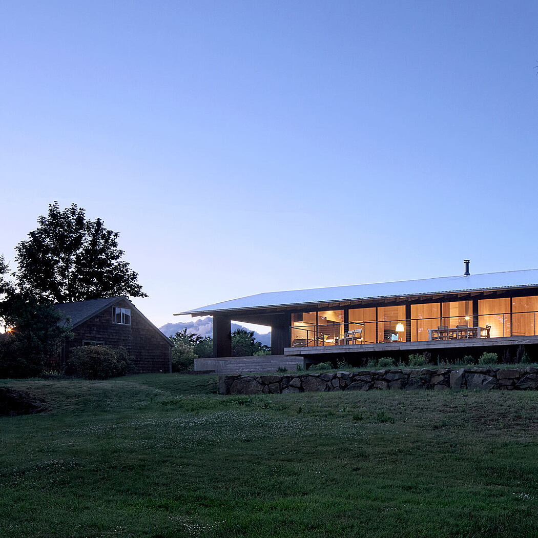 The Divine House is located outside of Eugene, Oregon and overlooks a dramatic bend along the McKenzie River. The house has a simple rectangular footprint and a gable roof with deep overhangs. It is directly organized down the centerline of the plan below the ridge. The northern half contains the smaller, more cellular programs — the carport, entry, guest area, bathroom, and primary bedroom. The southern half is entirely open and includes the living and dining areas, kitchen, and adjoining covered deck. The width of the rooms and the generous depth of the overhangs was based on the maximum length of local Douglas fir structural members.