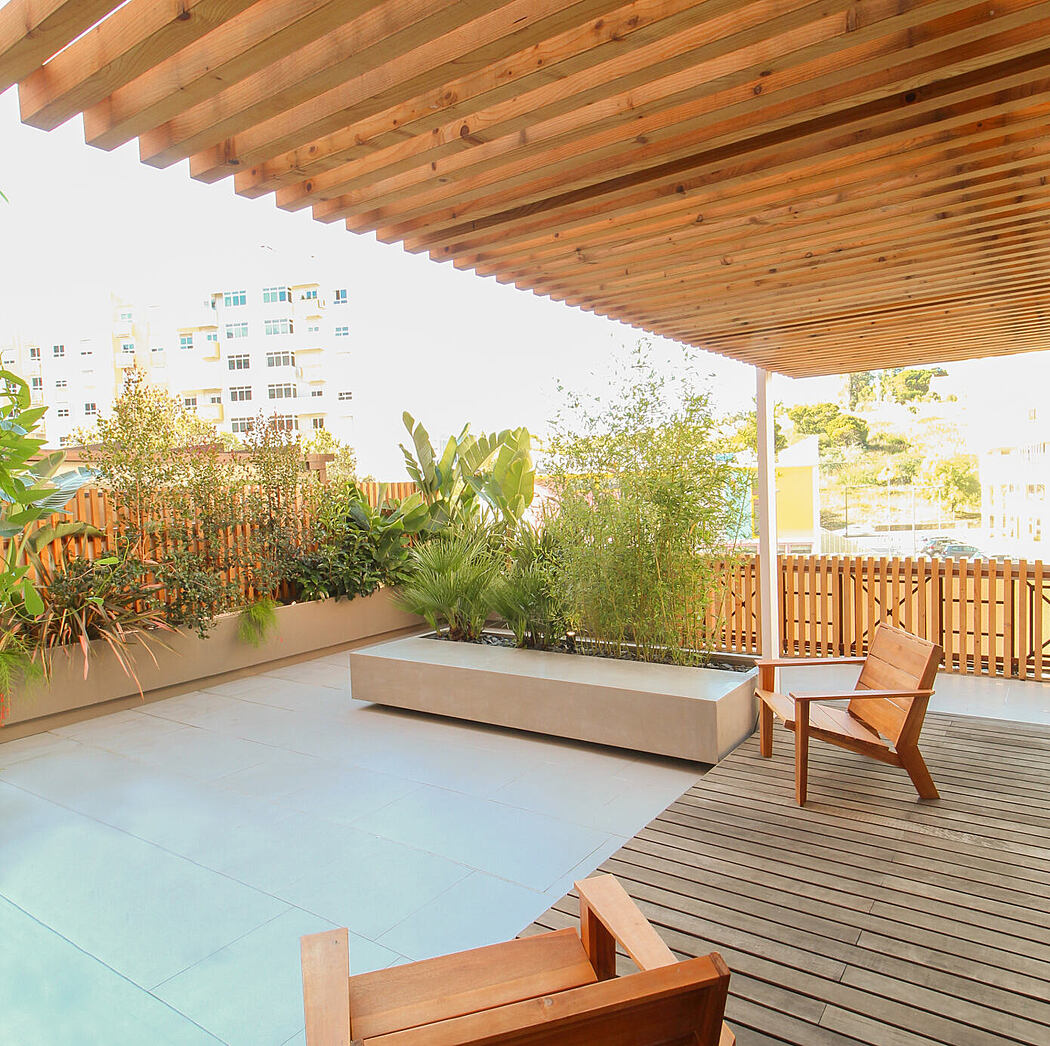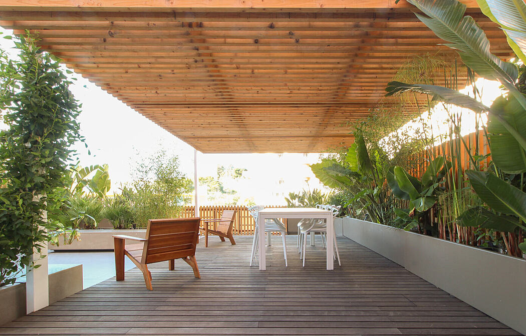 The terrace is essentially characterized by the presence of plants that contrast with the proposed wooden elements and by the pergola that accommodates an outdoor space for get-togethers