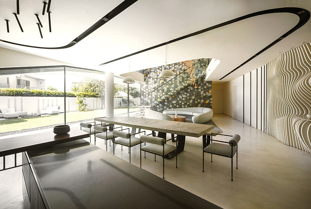 The built form is strategically placed on one edge of the site, resulting in a generous landscaped garden on west side of the plot which opens up to the double height family living & dining, thereby extending as an outdoor living room. The built form emerges from the landscape and blend the ground floor to the roof of the building, creating an outdoor connective spine for the villa. This meandering stepped walkway has an outdoor space on the first floor with outdoor shaded seating and connects further to the terrace. This outdoor terrace space created on the first floor acts as a balcony and at the same time as direct entrance to the first floor apartment. Landscape garden on the terrace enjoys the views of the neighbourhood park with a feeling of being nested with nature. These three outdoor spaces have different usability based on time of day and season of the year.