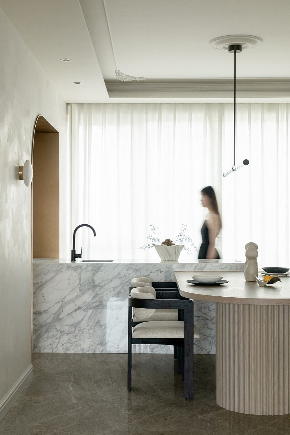 The foyer is highlighted by a wrinkled art installation, which is like a piece of undulating silk. The combination of wood and stone textures gives the white color more vivid artistic expressions. Complemented by lighting, the artwork embodies a sense of rituality and the courage of breaking with convention, adding unexpected fun to the residence.